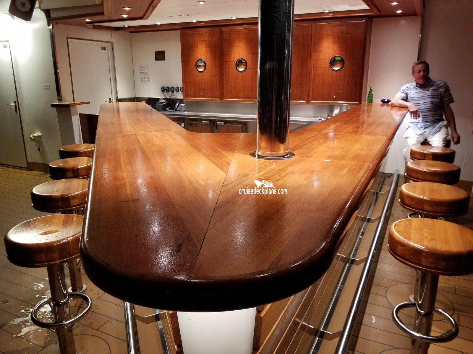 Bar serving aft Sun Deck area. Finest woods construction and wildly functional design. Has beautiful aft viewing with plenty of seating. Can be leased out for private parties. Aft elevator convenient right to deck 11