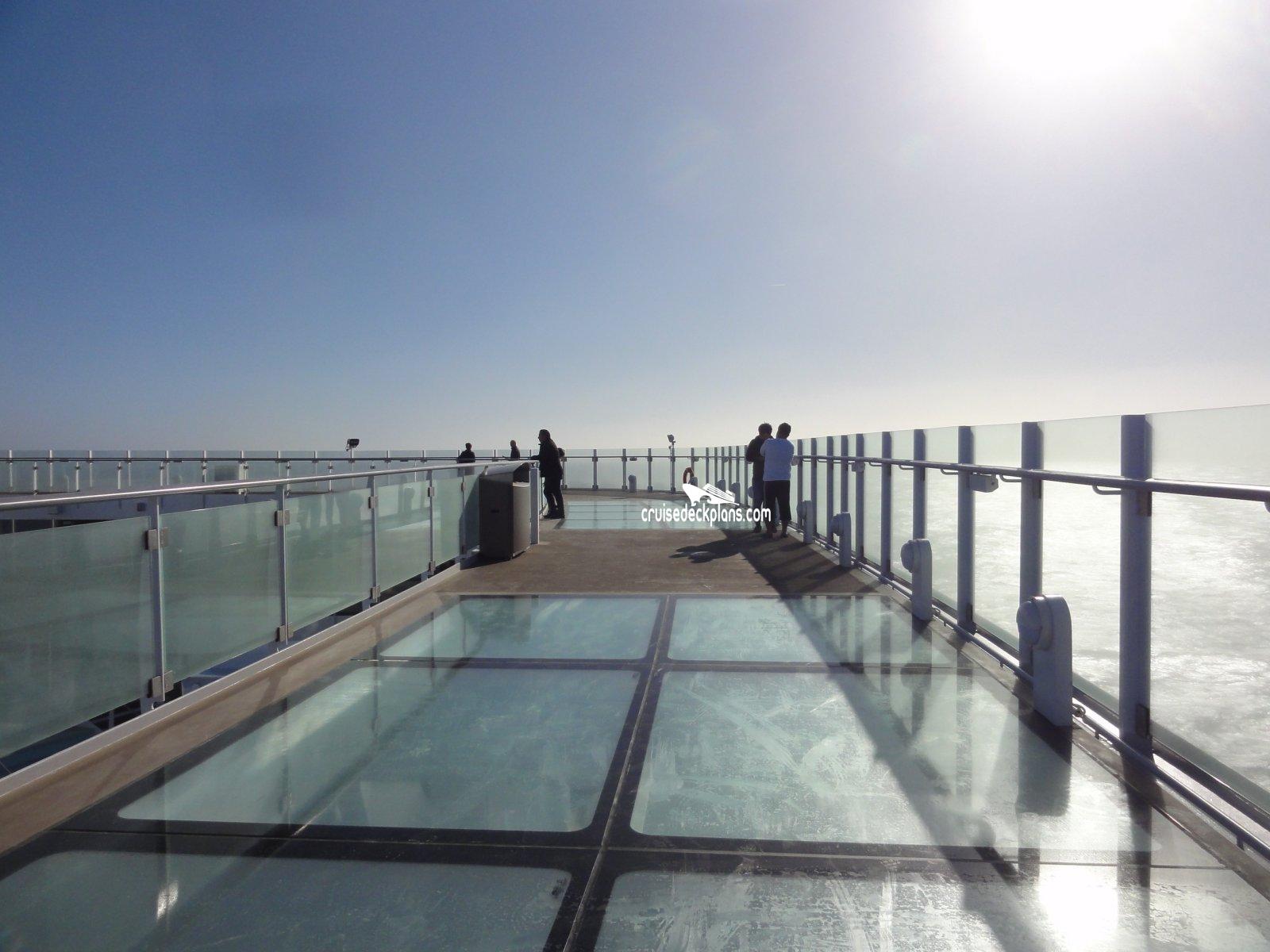 Aft multi-level outdoor stage area with stadium seating, large movie screen and bar. Features a walk way with glass floors.