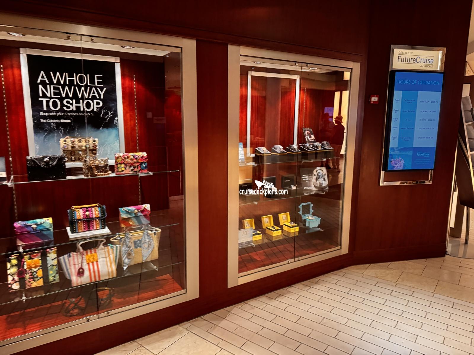 This page shows actual pictures for Celebrity Reflection Shops on the Boulevard. Most of our pictures are contributed by actual cruisers. You will find that all the Celebrity Reflection Shops on the Boulevard pictures on this page also posted directly onto our deck plans near the actual location the photo was taken. You can browse the pictures here or you can click on them as you are viewing the Celebrity Reflection deck plans. For deck plan viewing click on the ship button above or scroll down to view the pictures on this page.