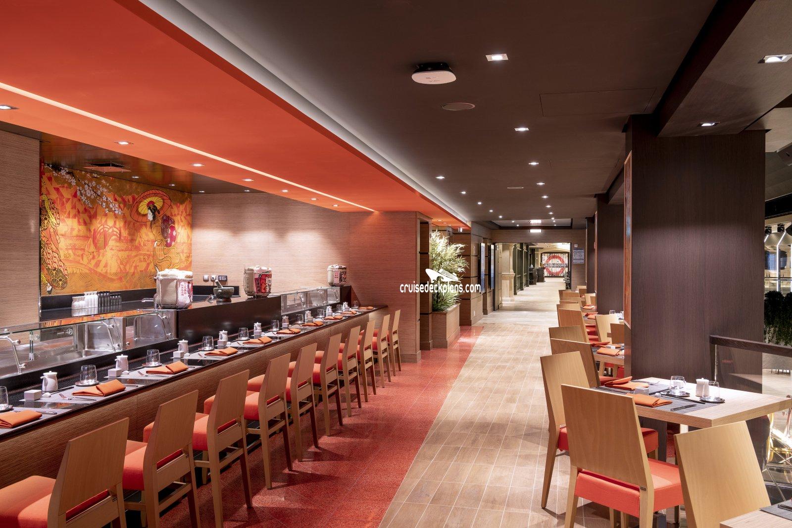 This page shows actual pictures for MSC Virtuosa Kaito Sushi Bar. Most of our pictures are contributed by actual cruisers. You will find that all the MSC Virtuosa Kaito Sushi Bar pictures on this page also posted directly onto our deck plans near the actual location the photo was taken. You can browse the pictures here or you can click on them as you are viewing the MSC Virtuosa deck plans. For deck plan viewing click on the ship button above or scroll down to view the pictures on this page.