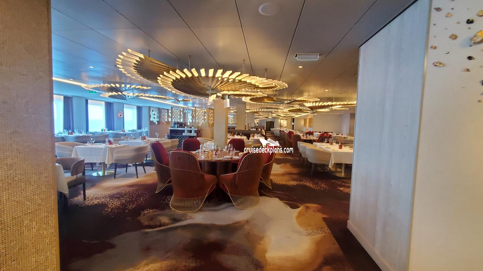 Mediterranean Style Dining. Seats 342 and serves Breakfast, Lunch (on sea days) and dinner. Represents Celebrity's Greek heritage designed by Patricia Urquiola with the main focus on seafood and features simple, clean dishes that celebrate the food and beverages in the Mediterranean region.