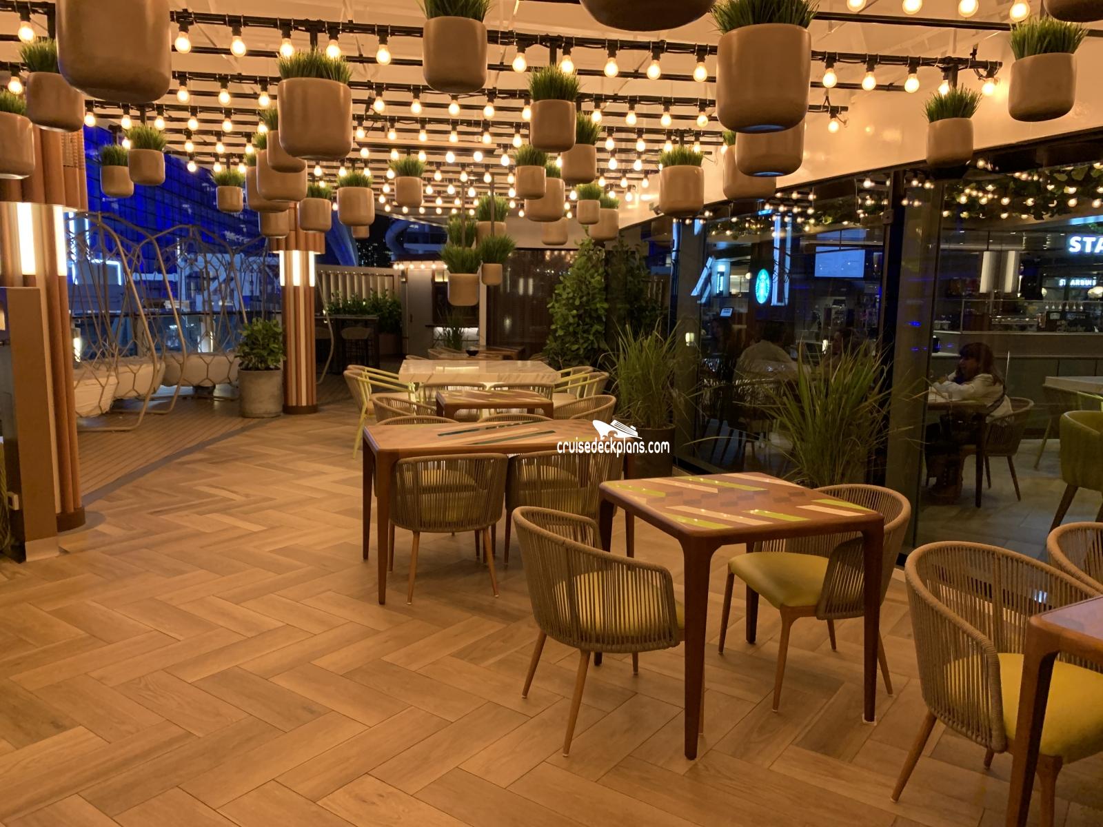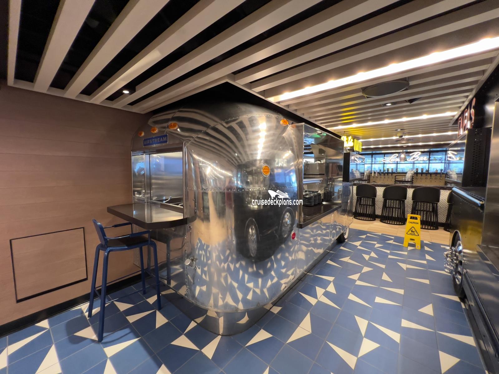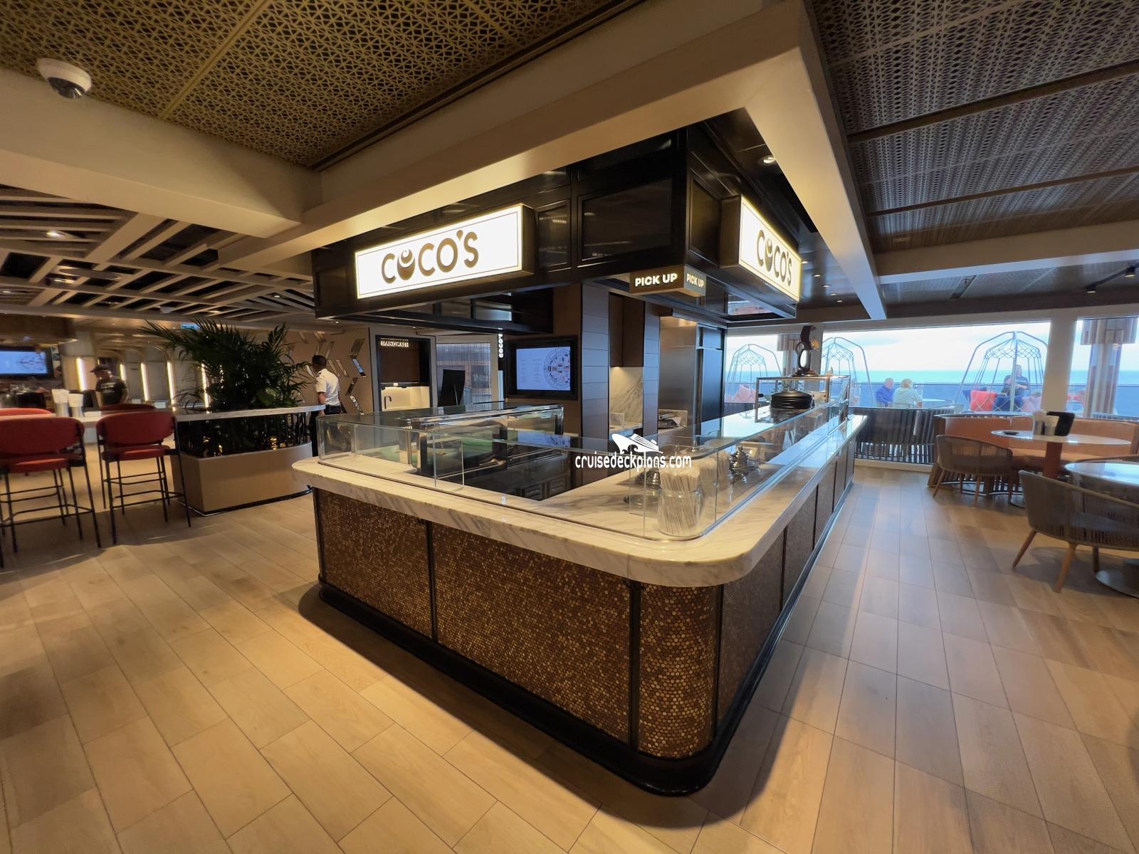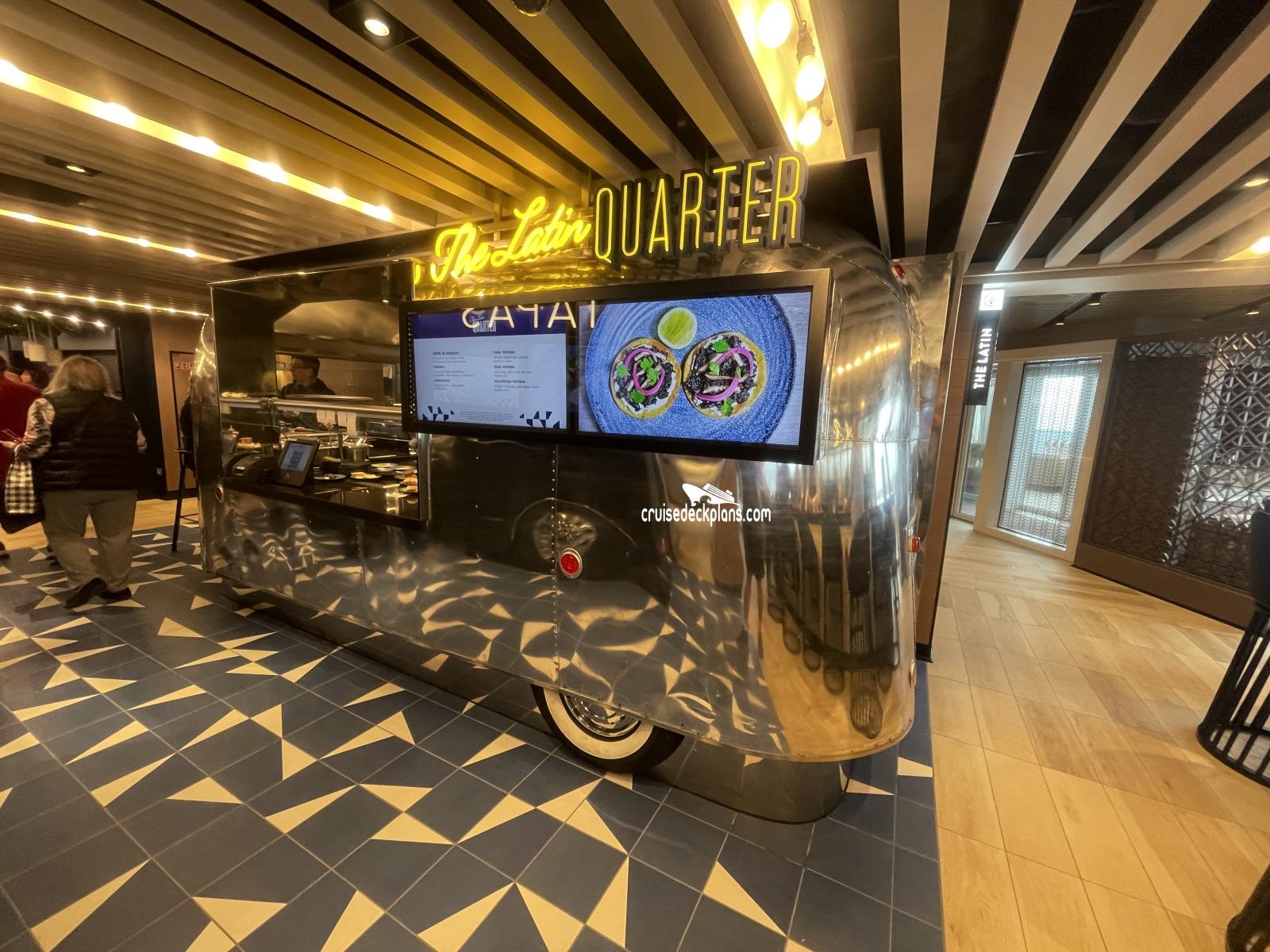 Food area featuring 11 stations located at deck 8 aft. Coco's, Q Texas Smokehouse, The Garden (Salad Bar), Starbucks kiosk, Tamara, Just Desserts, Just Ice Cream, and Seaside Rotisserie. Also food truck style featuring Nudis, Tapas Truck and the Latin Quarter.