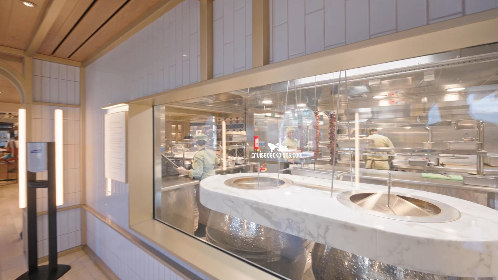 Food area featuring 11 stations located at deck 8 aft. Coco's, Q Texas Smokehouse, The Garden (Salad Bar), Starbucks kiosk, Tamara, Just Desserts, Just Ice Cream, and Seaside Rotisserie. Also food truck style featuring Nudis, Tapas Truck and the Latin Quarter.