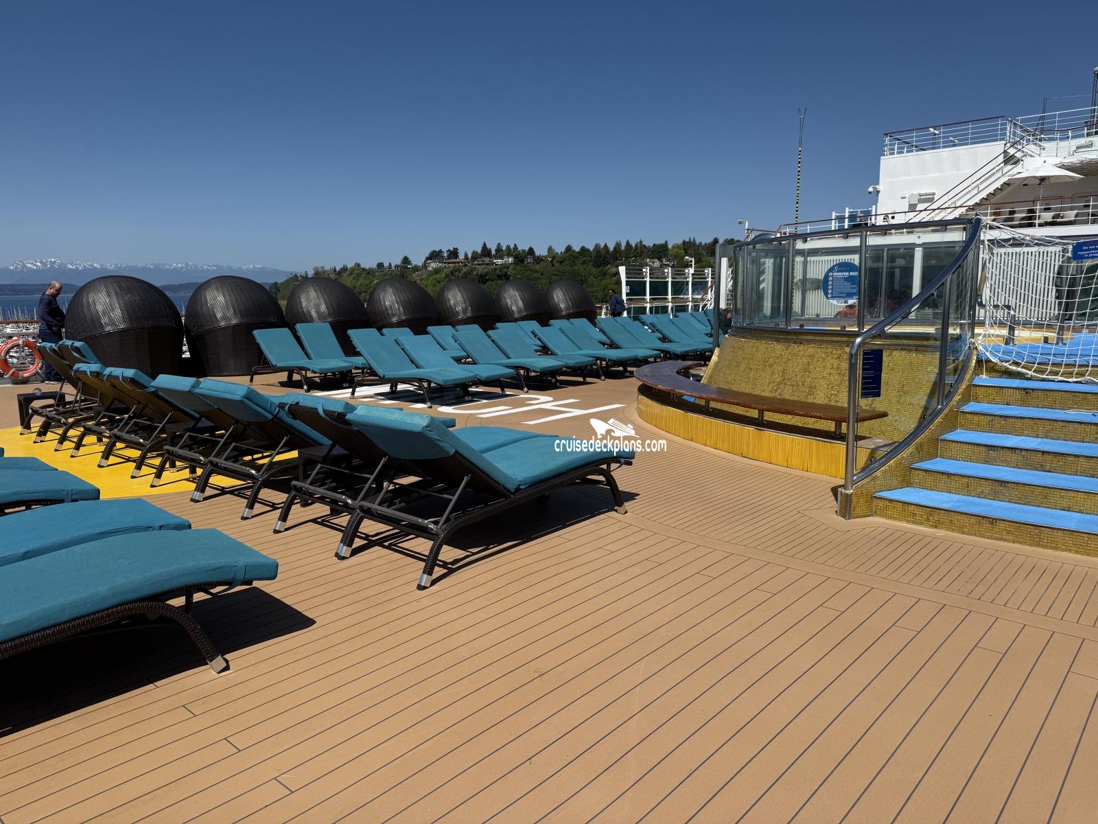 Hours: 8:00am-10:00pm / Hot Tub Spa: 8:00am-12:00am, weather conditions permitting / hours are subject to change. Adult-Only, outdoor private relaxation area on both the starboard and portside with shaded sun loungers and luxurious chaise lounges. Guests must be 21 years or older. Salt water pool (4'6" deep). 2 Hot Tub Spas. Piped in Music. Bar for beverage service ($).