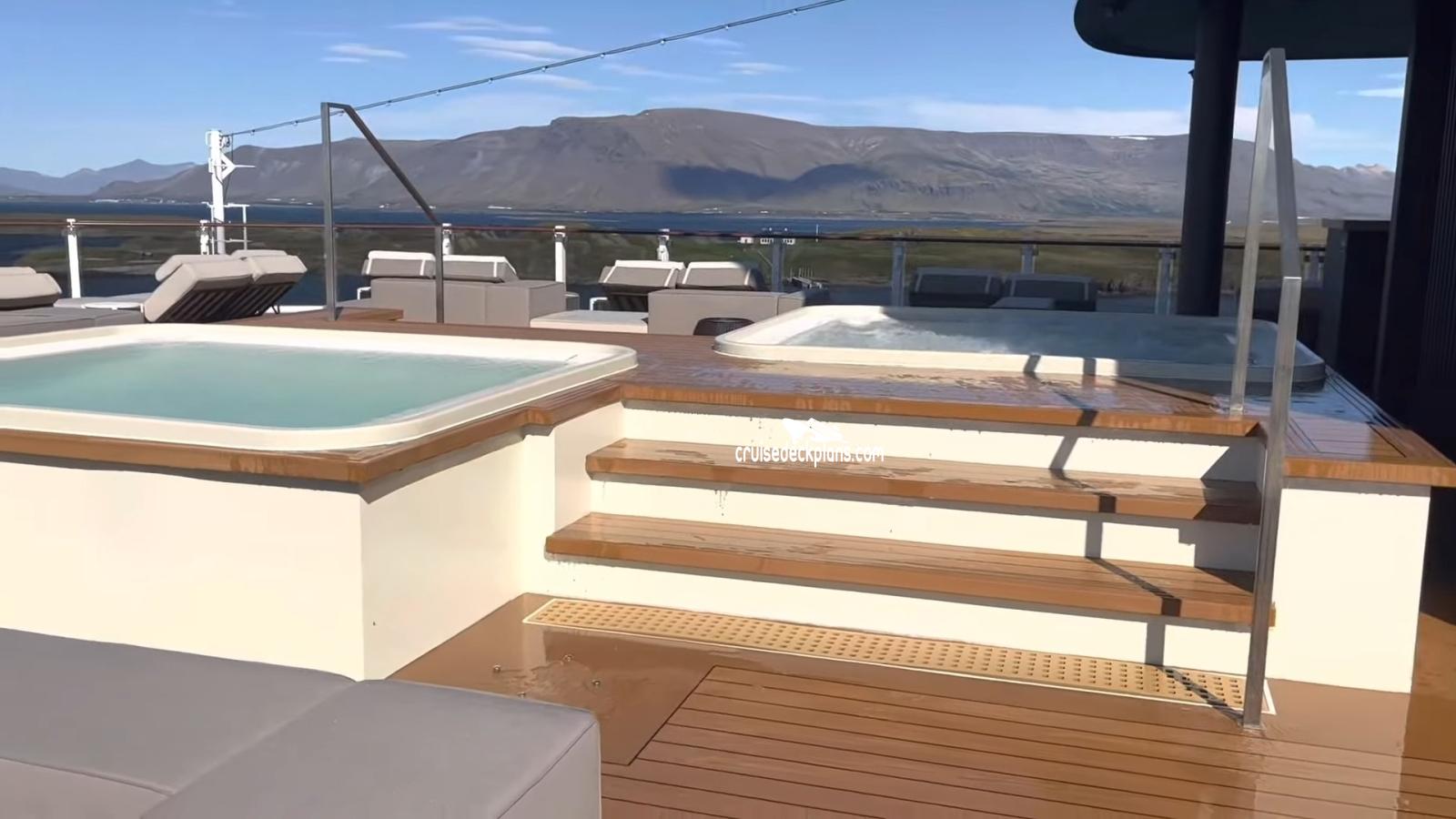 Spans two decks. Larger lower deck features a infinity pool with loungers, upper deck features two hot tubs and loungers. Views are fantastic off the aft of the ship. Exclusive for Haven guests age 16 and older.