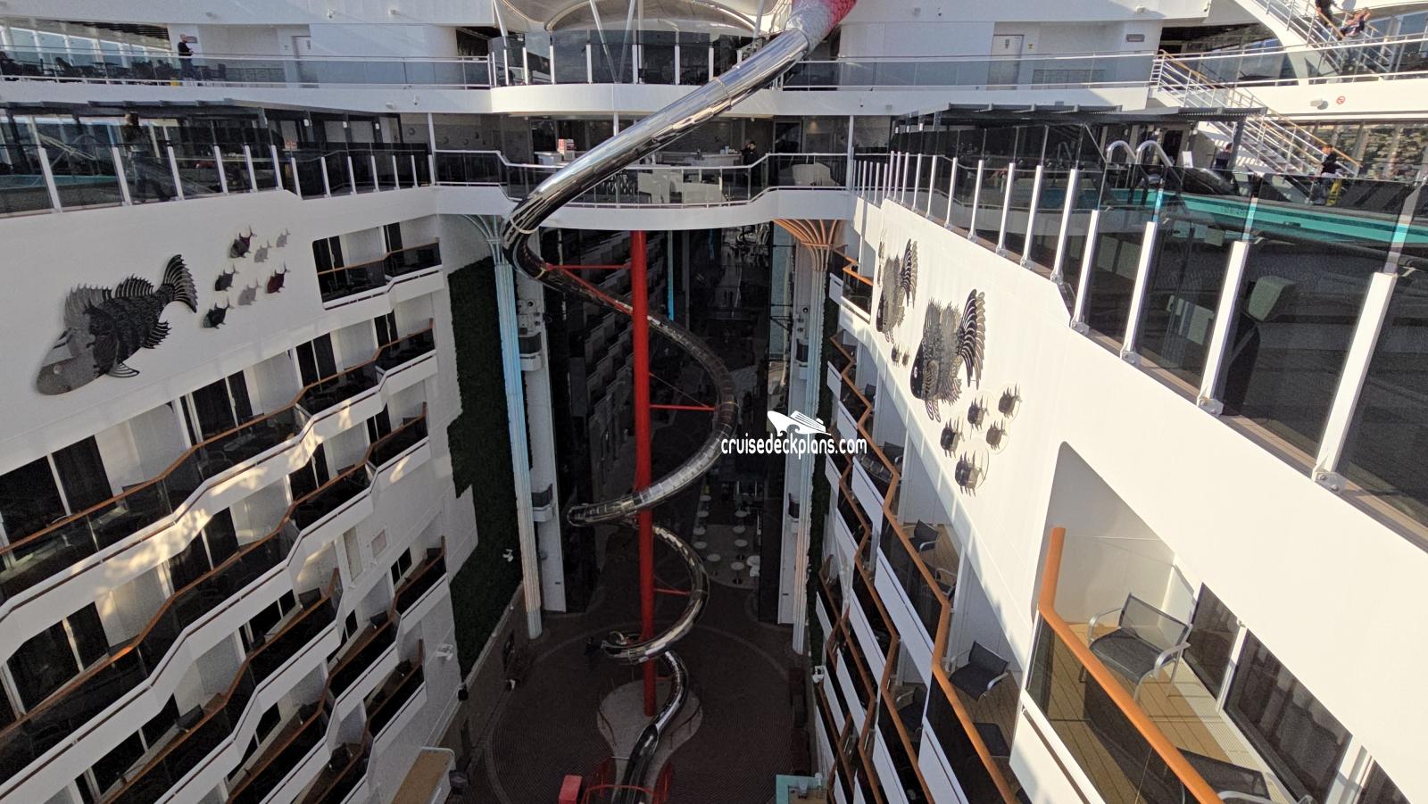 11-deck state-of-the-art architectural dry slide. Discover the longest at sea dry slide and descend swiftly through the ship from deck 20 to deck 8. A true piece of art made of stainless steel and spanning 11 decks.