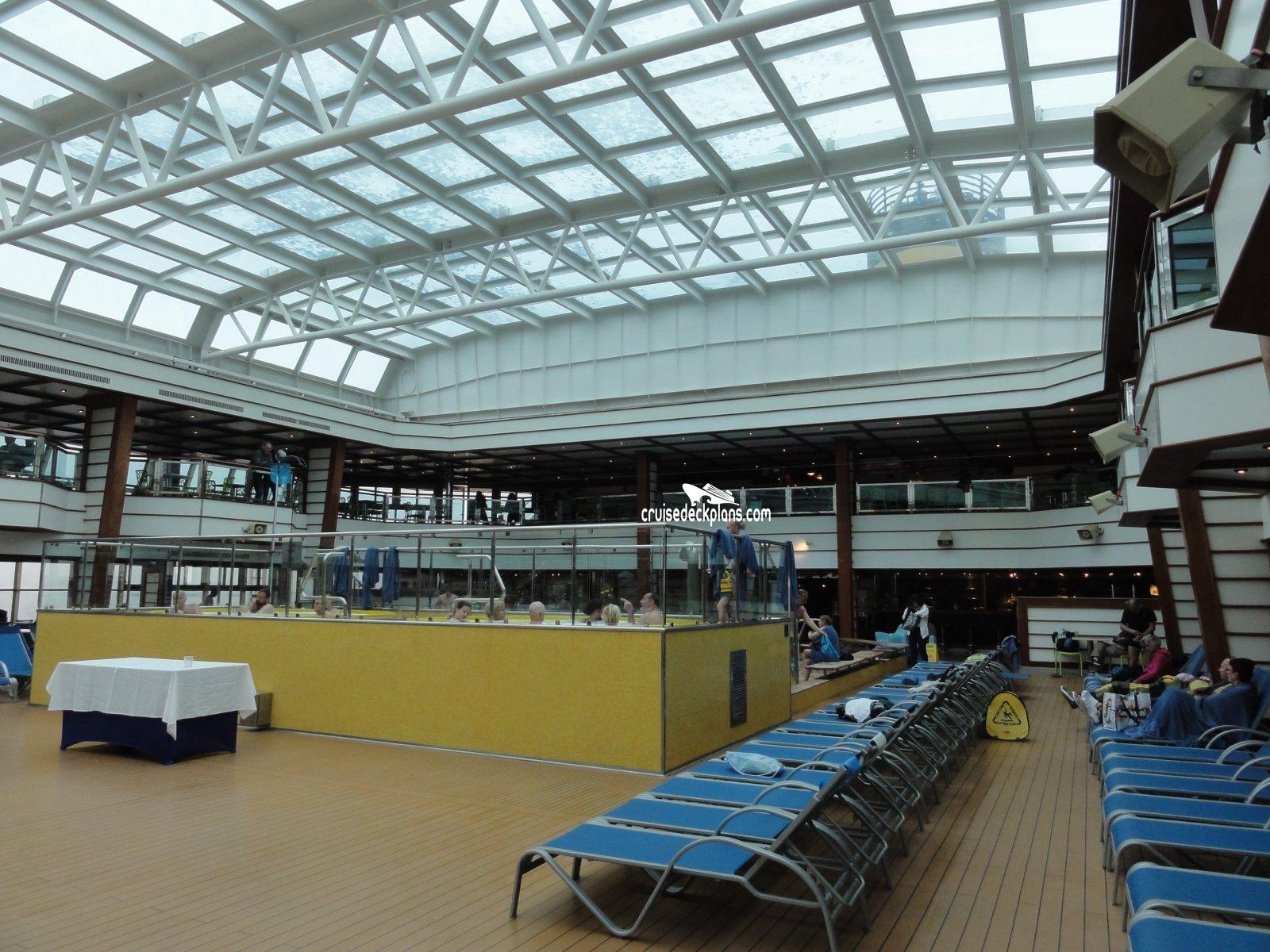 A large pool area that is flanked by two jacuzzi hydro massage baths and the ship's giant eighteen square meter screen airing music videos and sporting events.