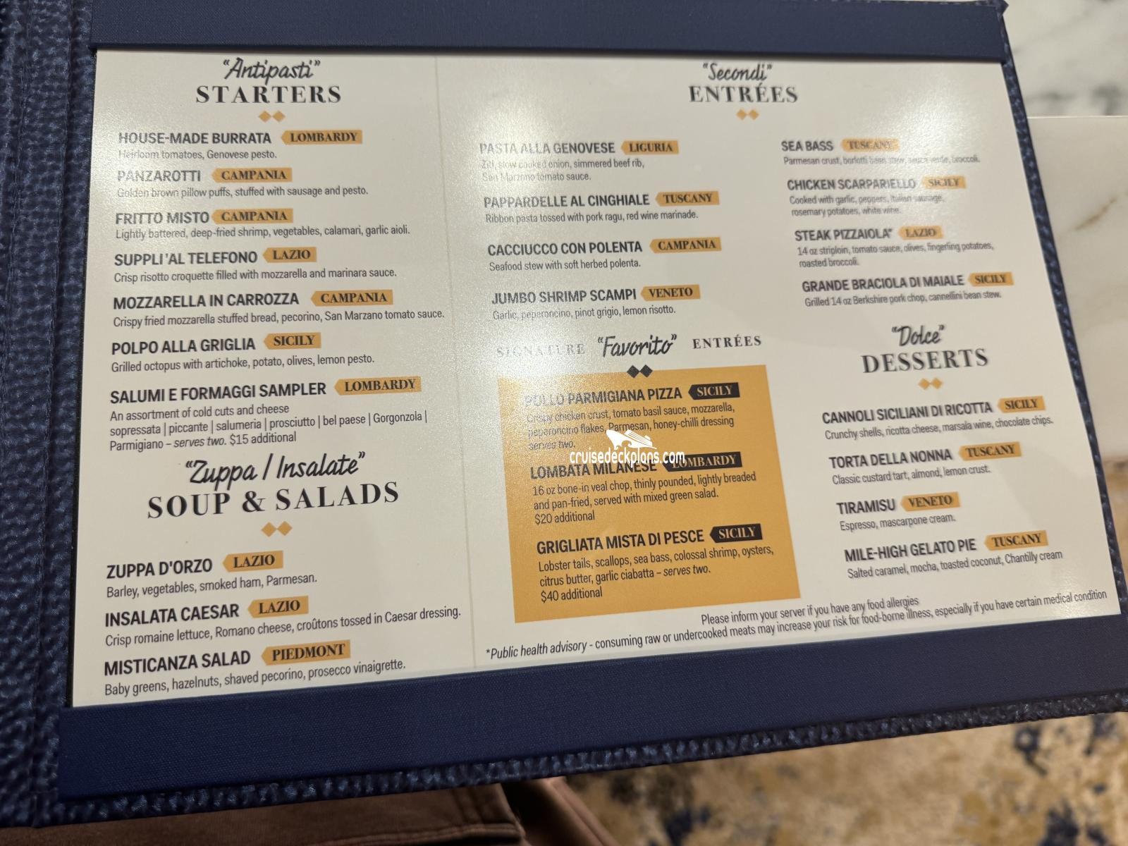 Specialty dining at a surcharge. Italian themed featuring flavors from Italy - including wines and cocktails. Signature dishes like Sicilian-inspired Pollo Parmigiana Pizza and Lombata Milanese veal chop. Freshly-baked focaccia.