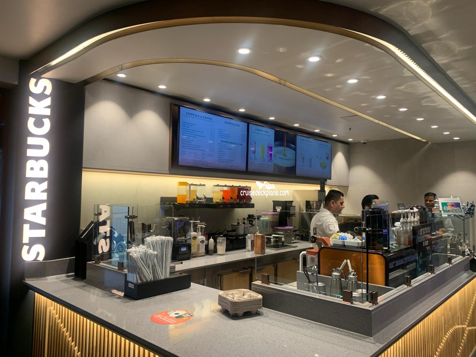 The Atrium has a bar and starbucks coffee. You will also find Guest Services and Shore Excursion Desk here. There is a large screen that plays movies and this venue is also used for trivia type shows.