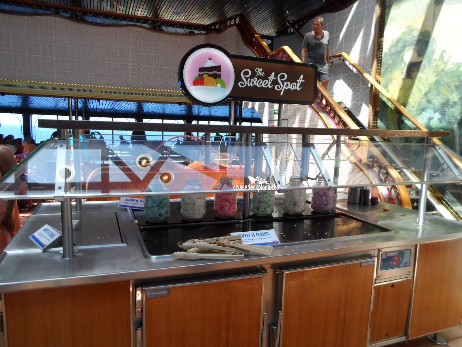 The ship's casual lido buffet international food court with seating for 1396, offering breakfast, lunch and dinner options.