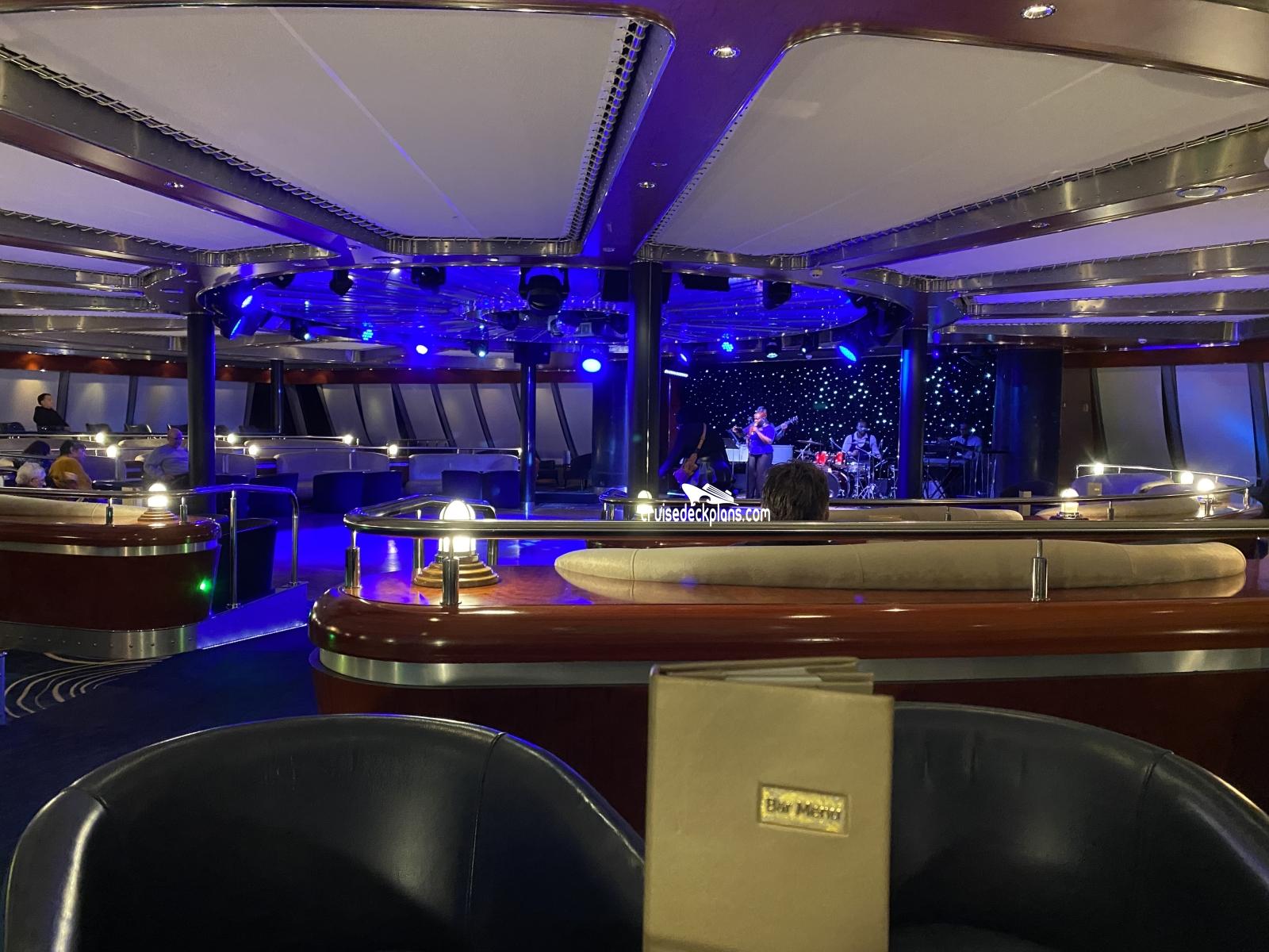 The ship's second main show lounge, can seat 372 guests and offers panoramic views of the ocean from the front of the boat due to its floor to ceiling windows making it an ideal observation lounge during the day. Featuring its own bar and dance floor it becomes home to the ships interactive game shows such as the Not-So-Newlywed show and DJ later on in the night with dancing into the small hours whilst during the day it is the location for activities such as bingo, dance classes and champagne art auctions.