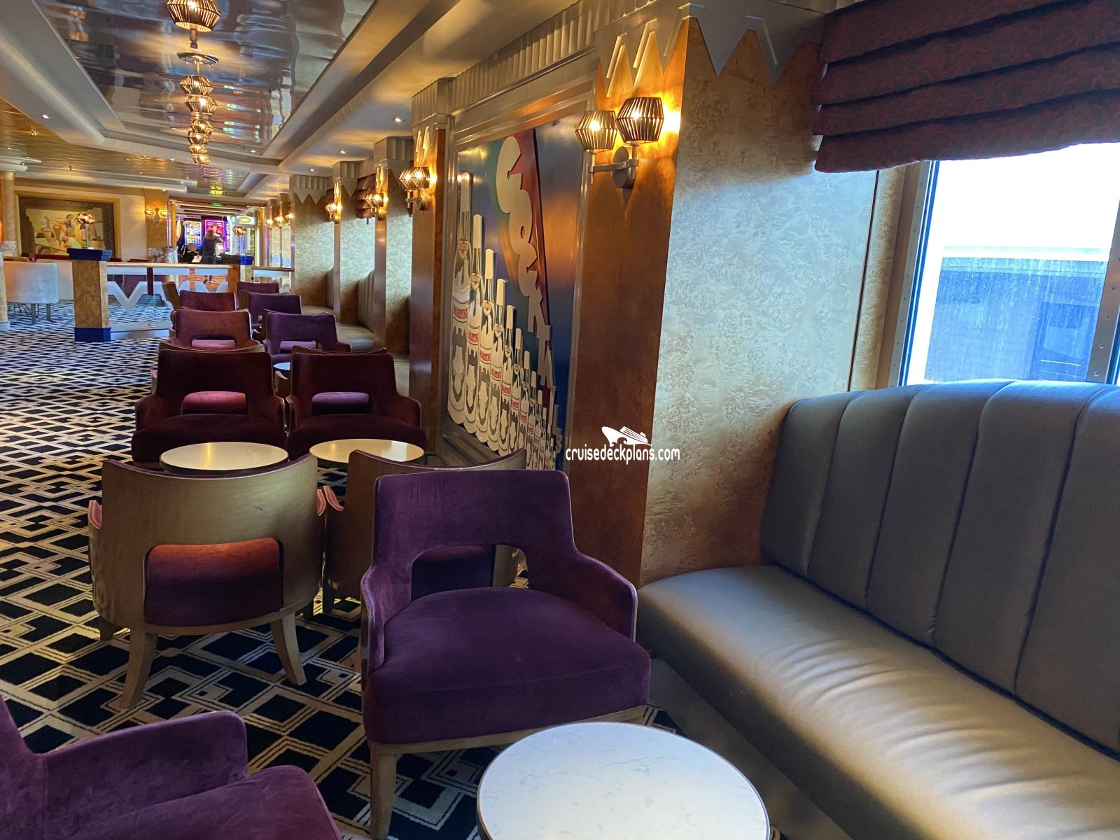 Accommodates 46 guests and serves up an extensive range of martinis and cocktails for guests to enjoy in surroundings depicting James Bond style graphic silhouette images from the 60's and 70's. Operational hours are from around 3pm until close. Martini tasting also takes place here where for around $15 guests can sample four different martinis.
