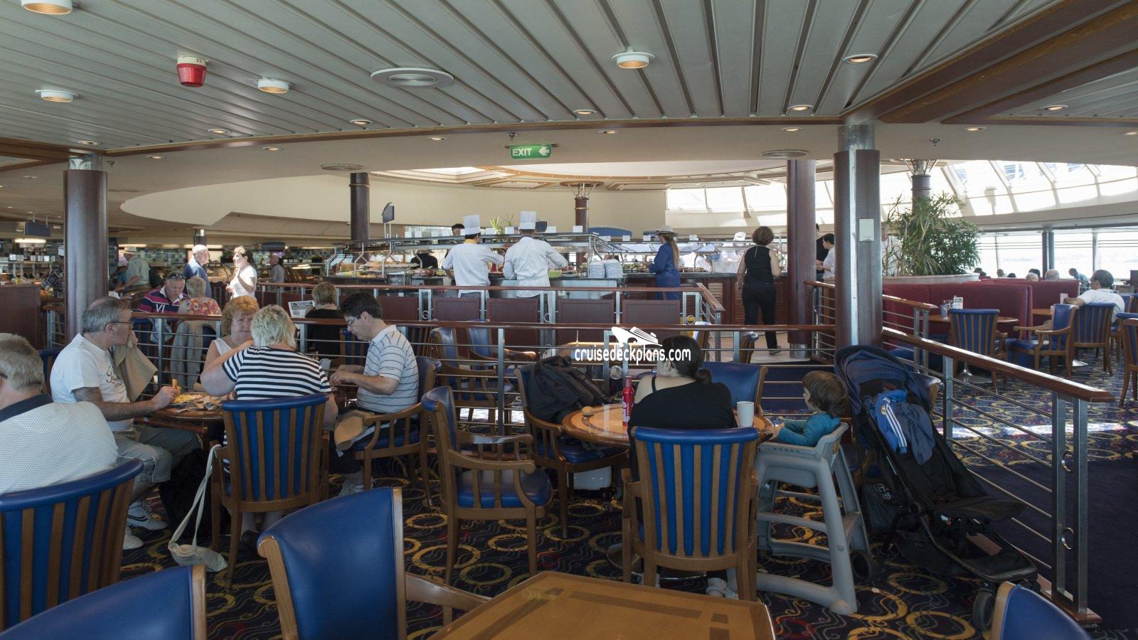 Offers a wide range of stations including Asian Flavours, Carvery, Vegetables and Salads, Pasta, Seafood, Daily Specials and Desserts plus a tea, coffee and water 24 hour self service stand (starboard side) and self-serve soft ice cream with choice of vanilla, chocolate and vanilla chocolate twist . With a choice of indoor seating or alfresco seating, the cafe offers buffet-style breakfasts and lunches whilst in the evenings the casual atmosphere is complemented by a changing menu and restaurant-style service with dishes on offer emulating those in the main dining room.