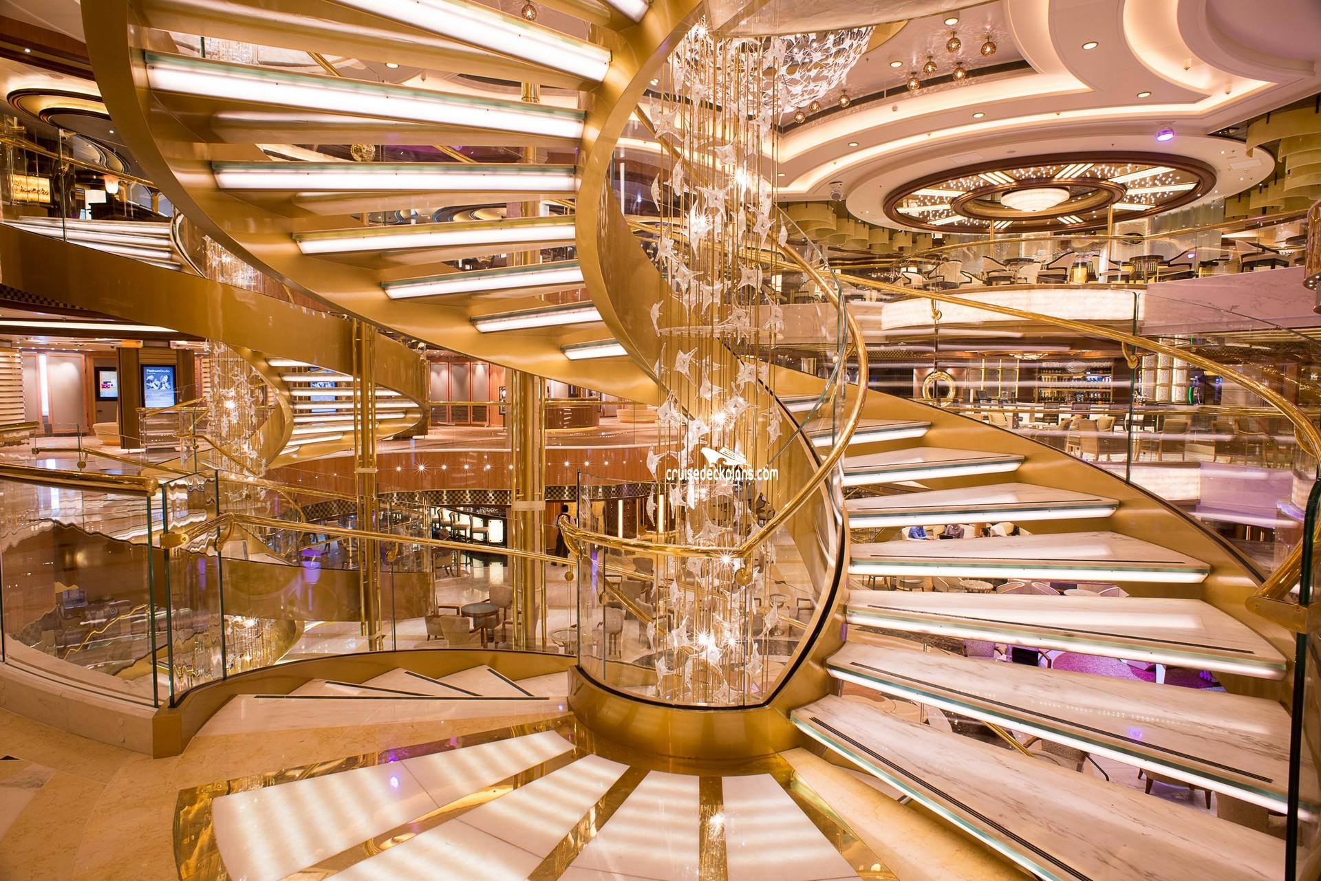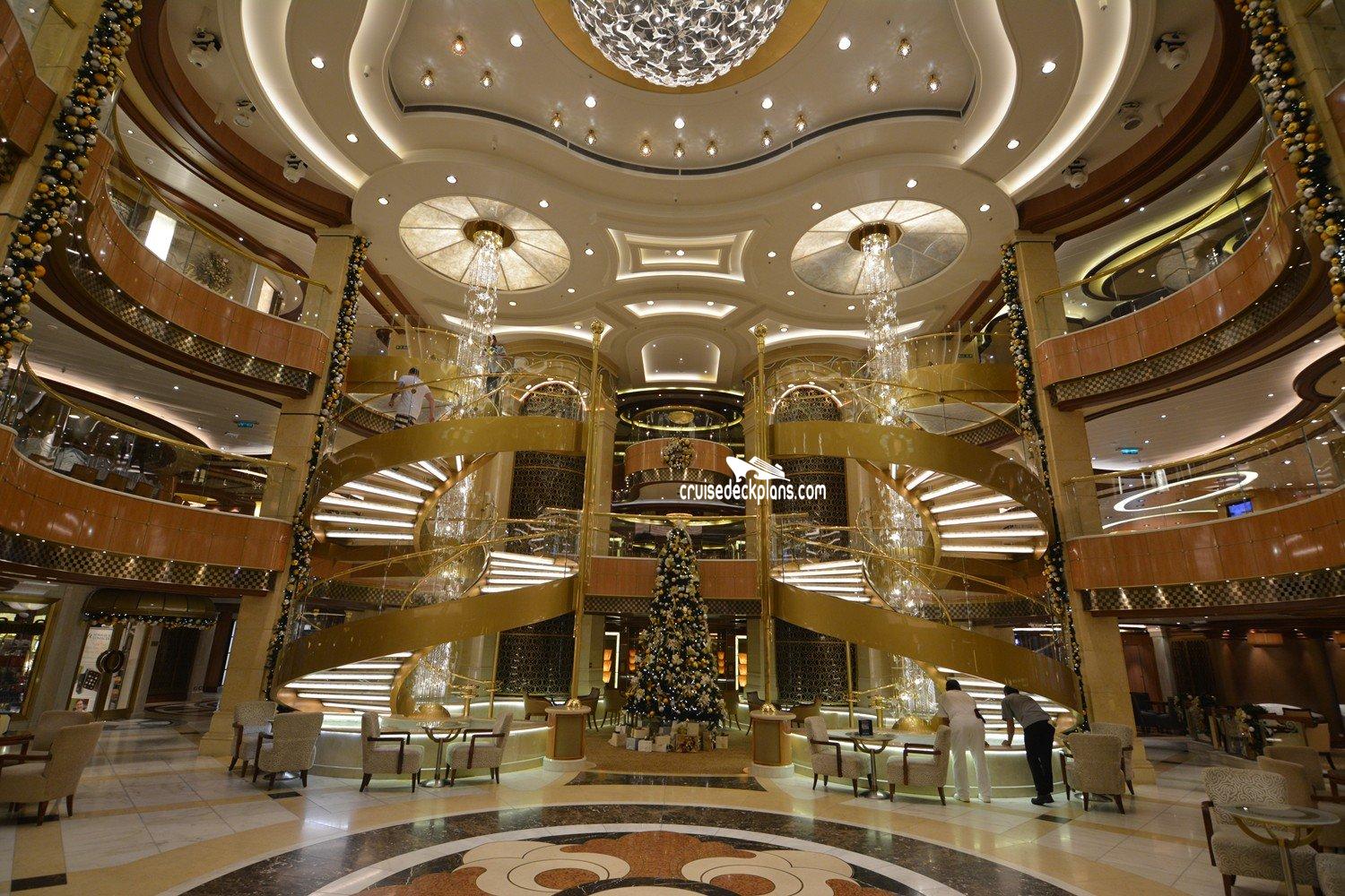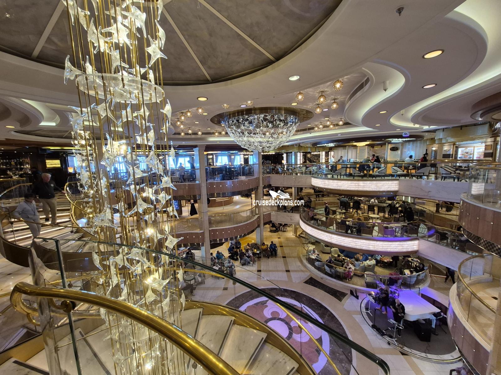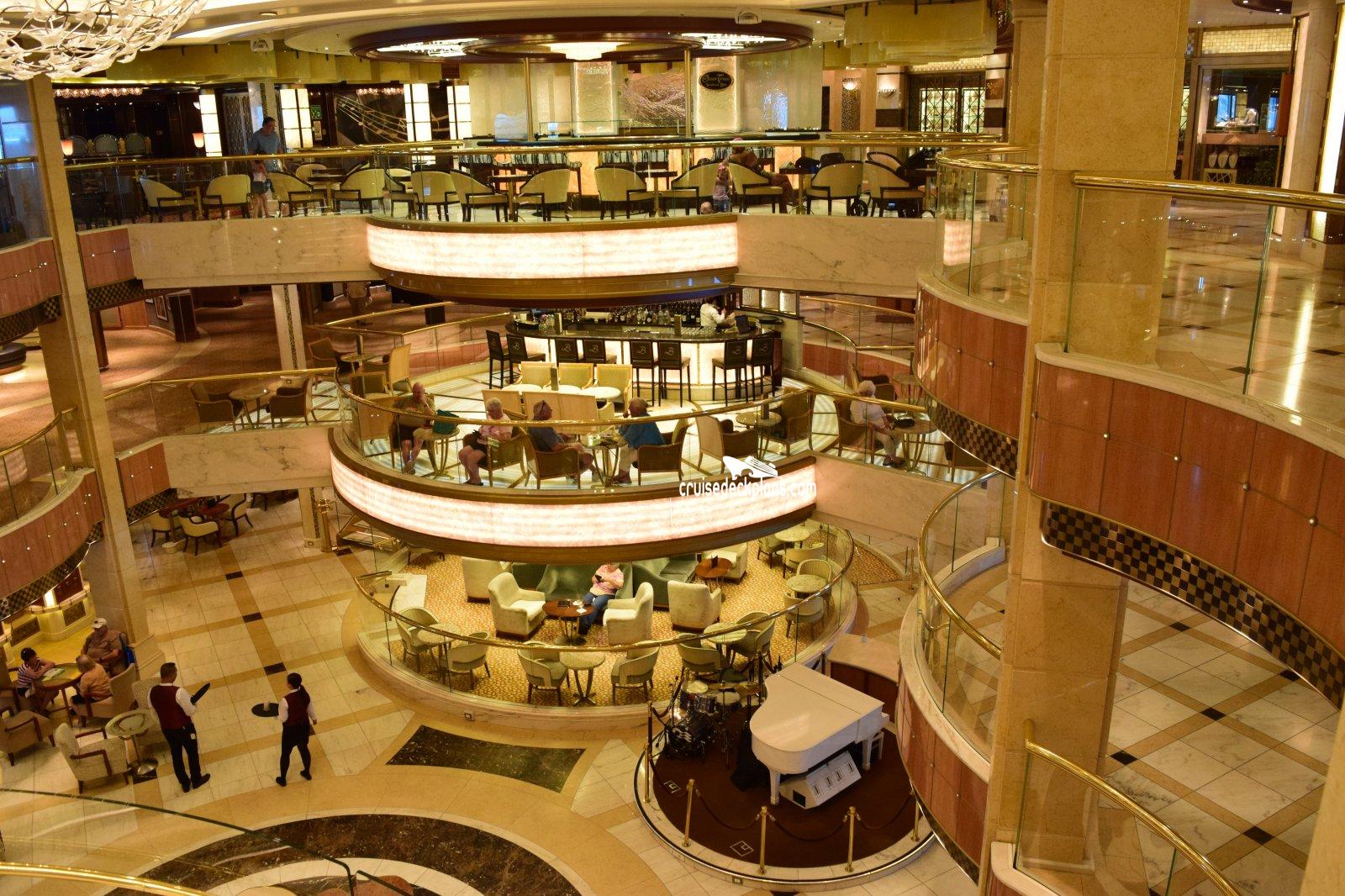 The central hub of the Royal Princess, featuring a three deck glass atrium and two sweeping marble staircases lit by lines of light descending from the apex down to the water features below. There is a stage featuring a variety of entertainment during the day and night from musicians and performers to demonstrations.