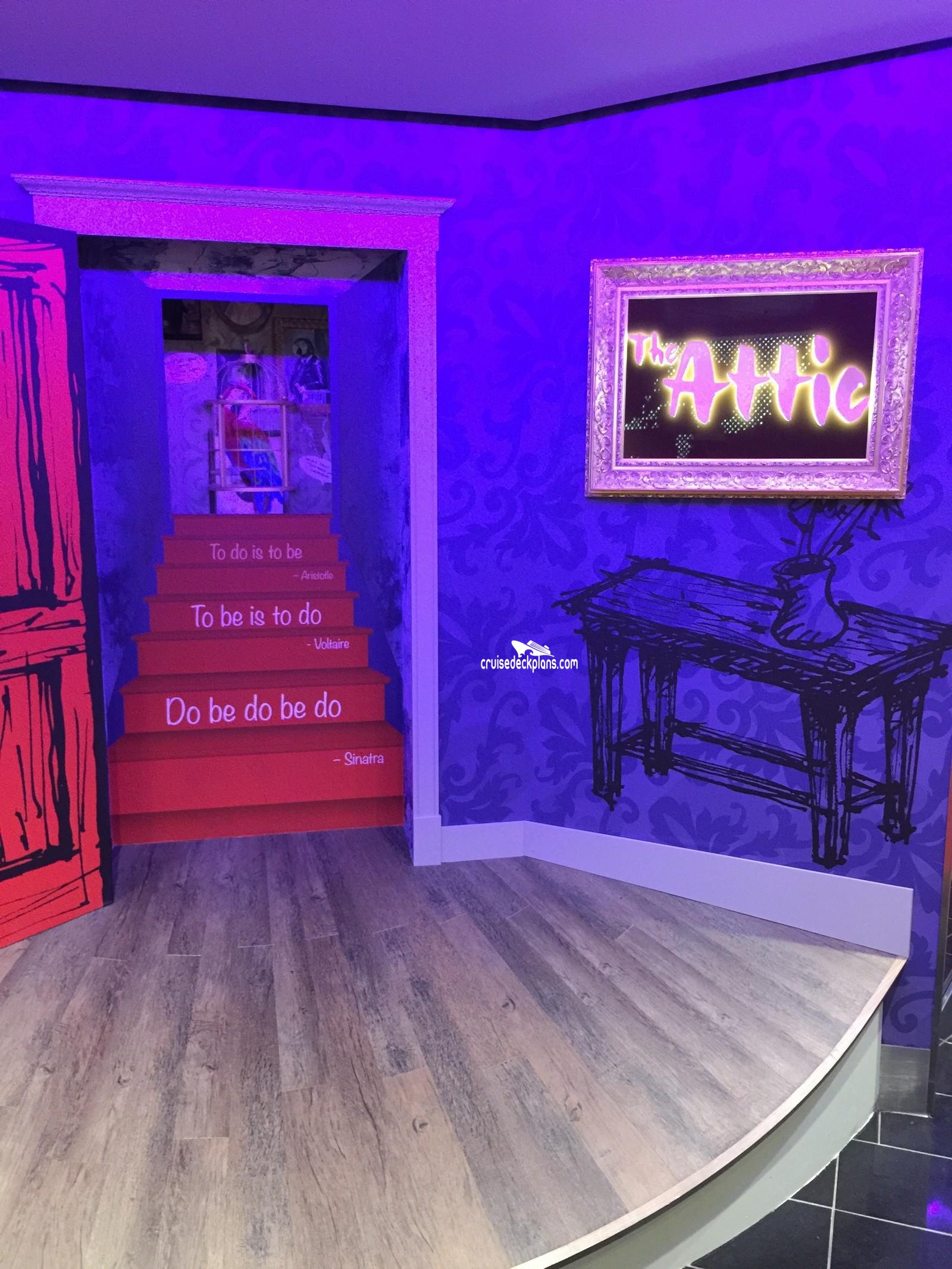 This page shows actual pictures for Harmony of the Seas The Attic. Most of our pictures are contributed by actual cruisers. You will find that all the Harmony of the Seas The Attic pictures on this page also posted directly onto our deck plans near the actual location the photo was taken. You can browse the pictures here or you can click on them as you are viewing the Harmony of the Seas deck plans. For deck plan viewing click on the ship button above or scroll down to view the pictures on this page.