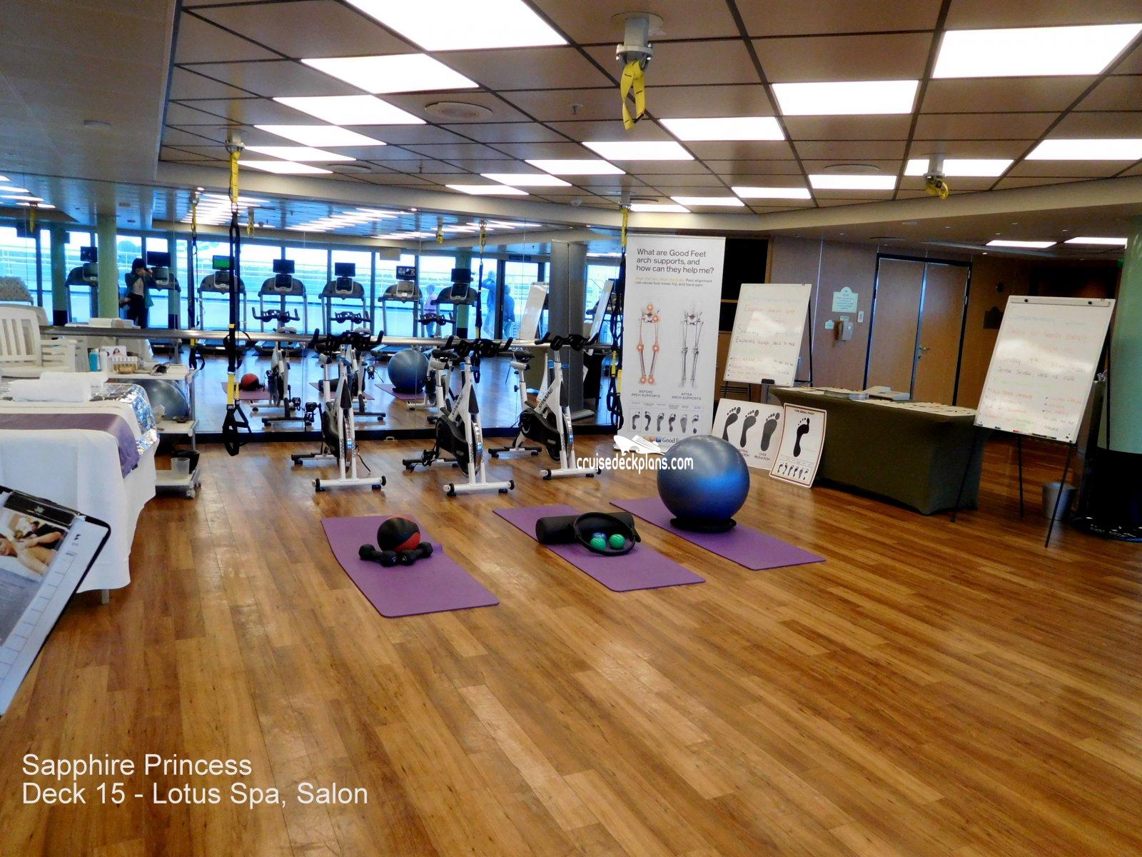 This page shows actual pictures for Sapphire Princess Fitness Center. Most of our pictures are contributed by actual cruisers. You will find that all the Sapphire Princess Fitness Center pictures on this page also posted directly onto our deck plans near the actual location the photo was taken. You can browse the pictures here or you can click on them as you are viewing the Sapphire Princess deck plans. For deck plan viewing click on the ship button above or scroll down to view the pictures on this page.
