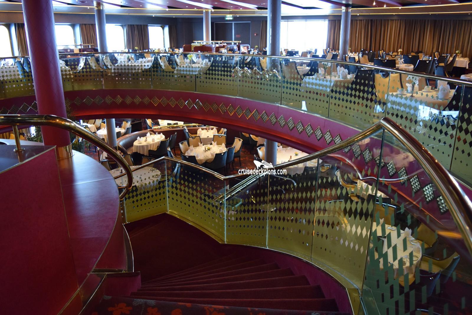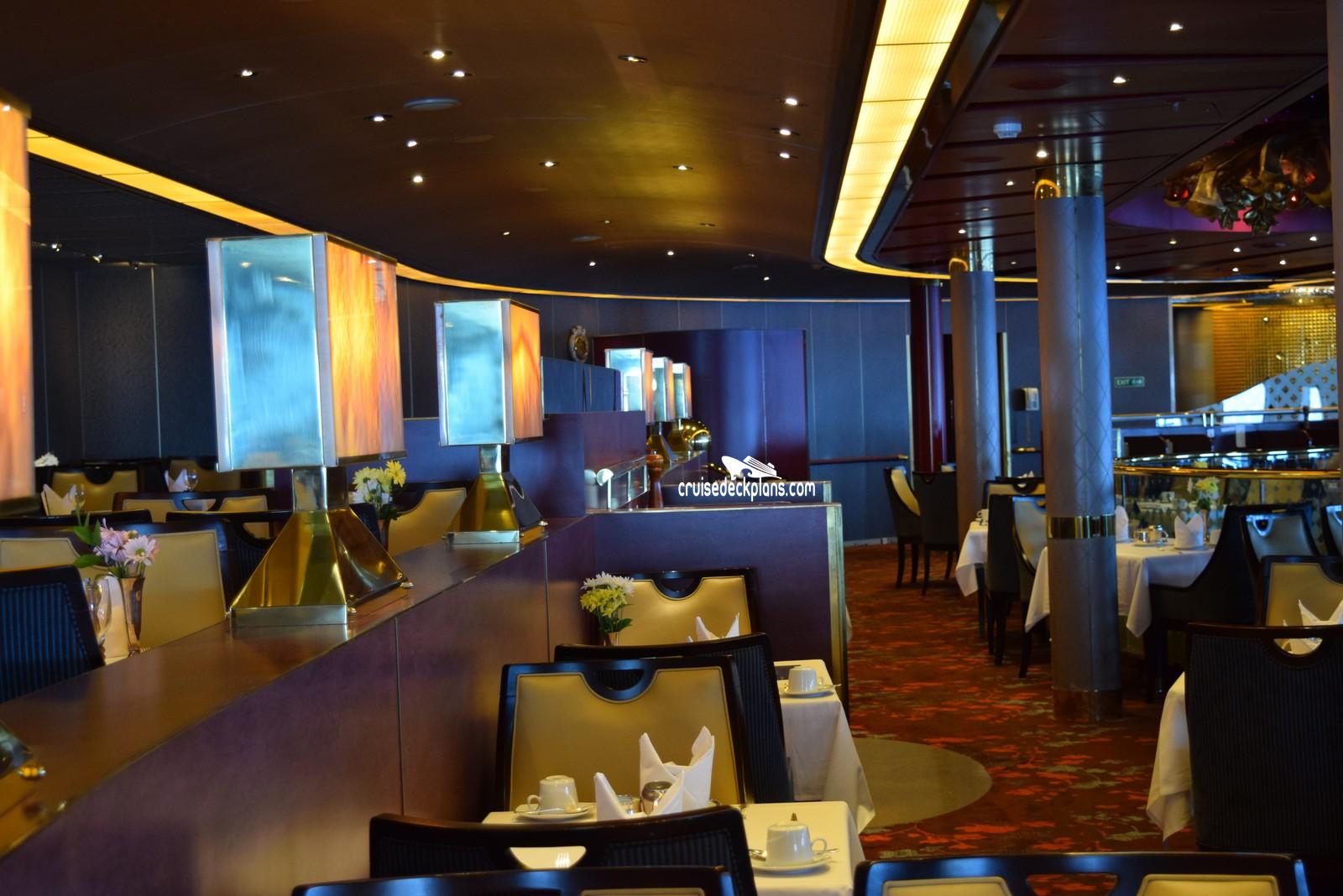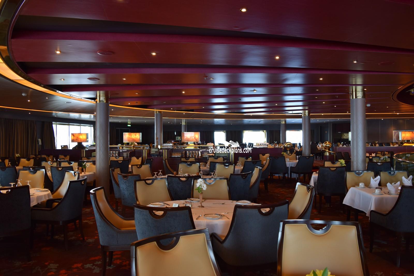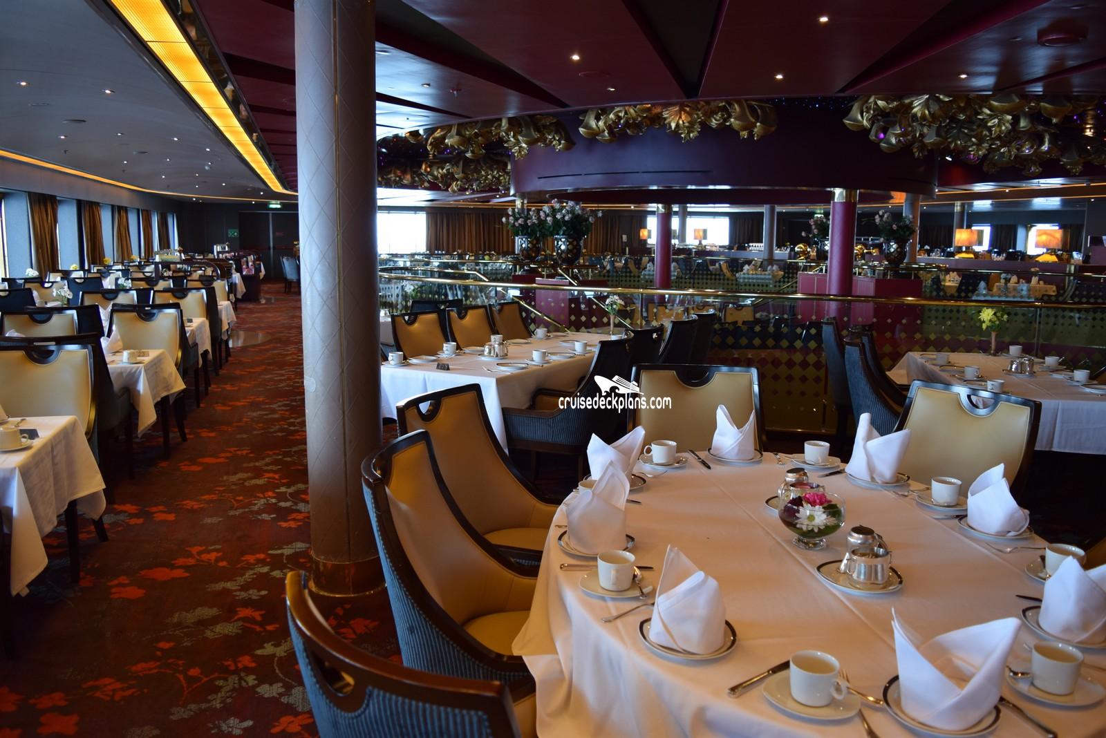 The ship's Main Dining Room located over 2 tiers on decks 2 and 3. Open for breakfast, lunch, afternoon tea and dinner, the restaurant offers a choice of either traditional pre-set seating and dining times or the ships "As You Wish" freedom dining.