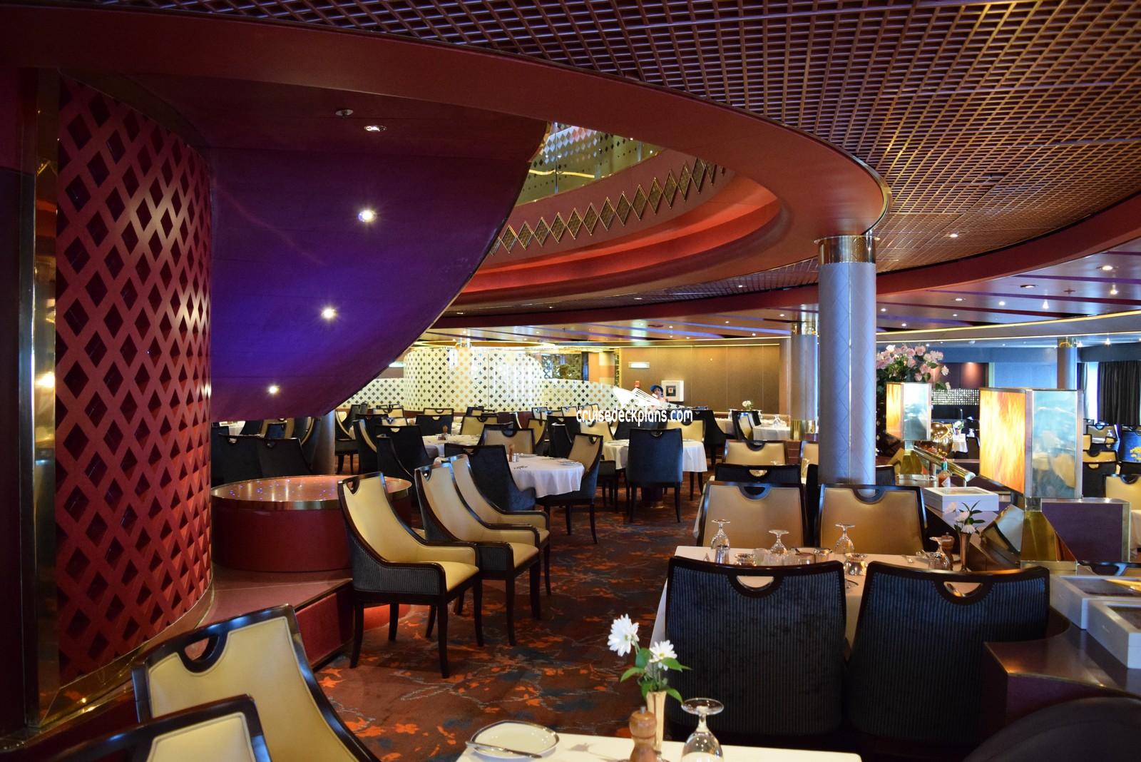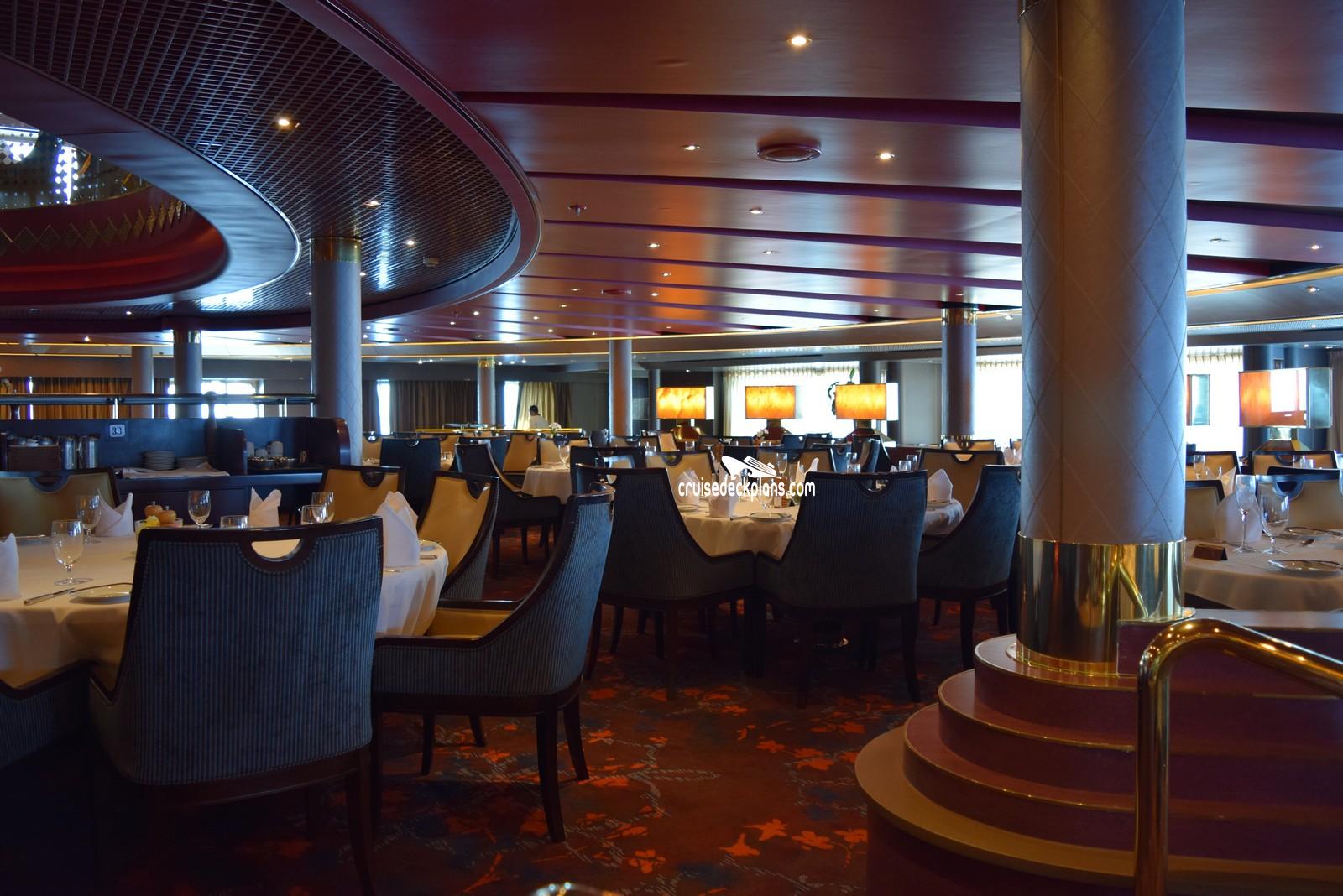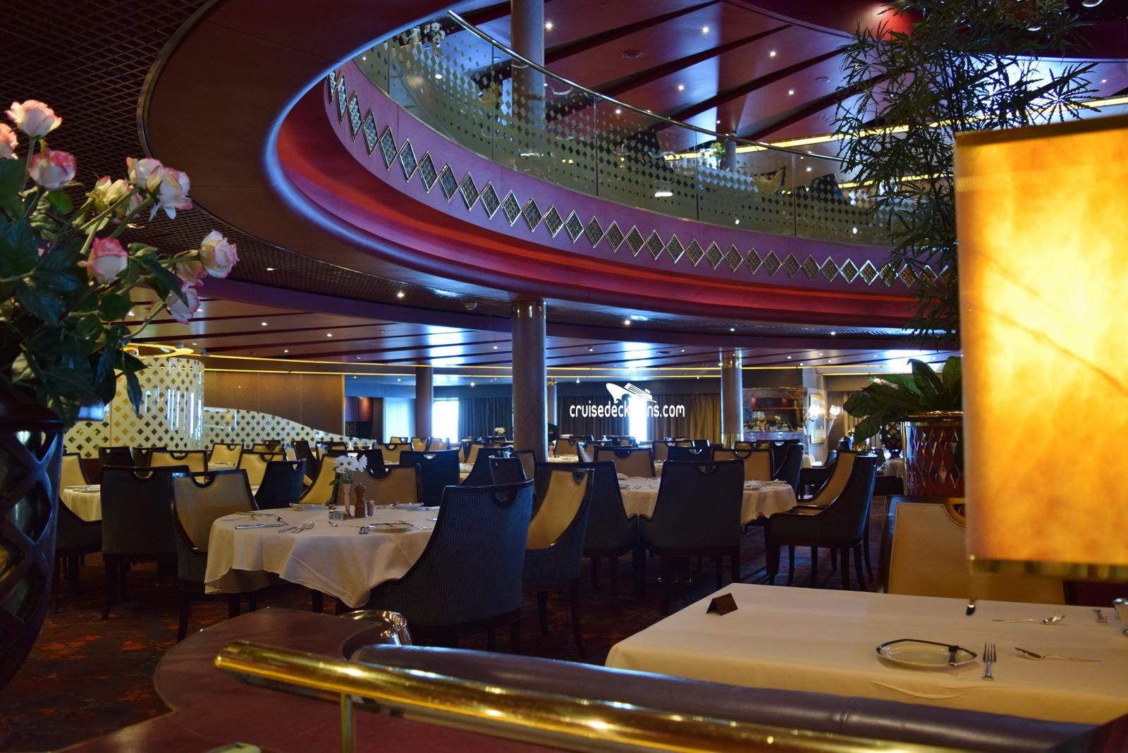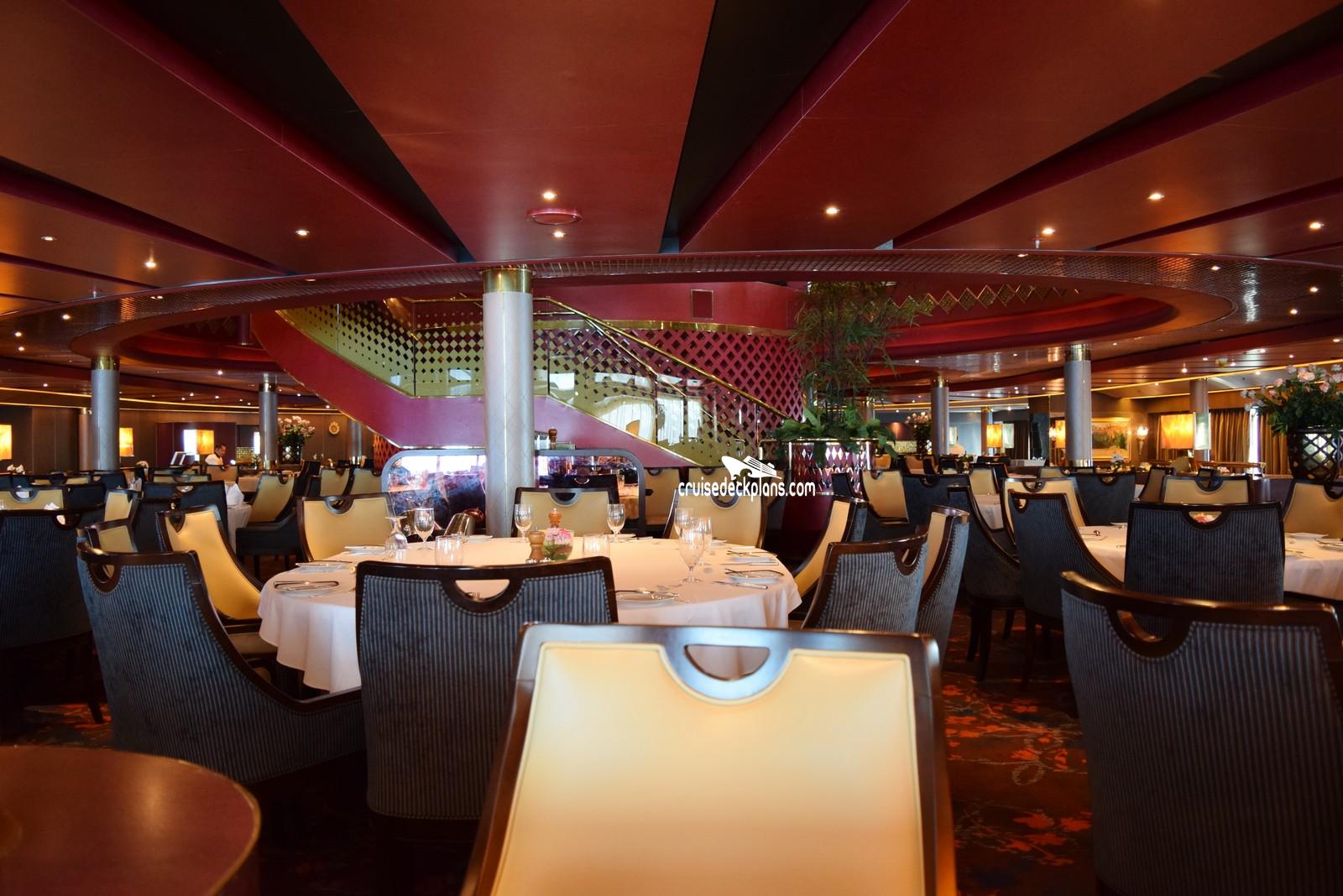 The ship's Main Dining Room located over 2 tiers on decks 2 and 3. Open for breakfast, lunch, afternoon tea and dinner, the restaurant offers a choice of either traditional pre-set seating and dining times or the ships "As You Wish" freedom dining.