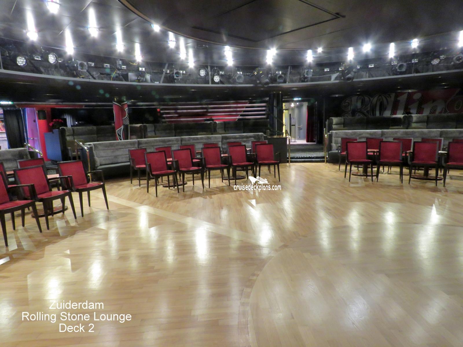 This page shows actual pictures for Zuiderdam Rolling Stone Lounge. Most of our pictures are contributed by actual cruisers. You will find that all the Zuiderdam Rolling Stone Lounge pictures on this page also posted directly onto our deck plans near the actual location the photo was taken. You can browse the pictures here or you can click on them as you are viewing the Zuiderdam deck plans. For deck plan viewing click on the ship button above or scroll down to view the pictures on this page.