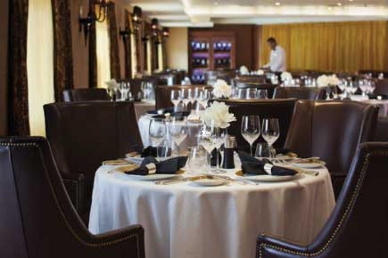 Restaurant on starboard side of ship open for dinner (reservation only) serving an American Steakhouse menu. Features wood furnishings, wingback leather chairs.