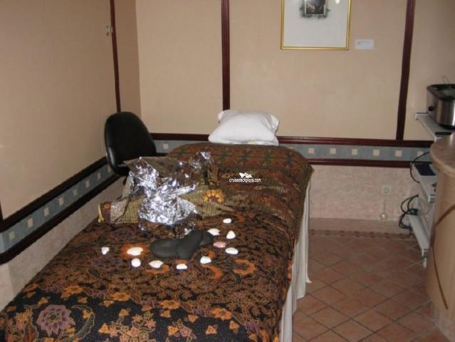Spa, Fitness Center and Beauty Salon. The Spa is open frm 8 a.m. to 8:00 p.m. Locker rooms are available free of charge. The Spa Terrace (located on the bow) has loungers and outdoor spa with massaging jets. The Terrace is free for suite guests, otherwise there will be a charge by the day or for the cruise. The Fitness Center is open between 6 a.m. and 10 p.m. You will find weights, recumbent and stationary bikes, treadmills, elliptical trainers. There is a aerobics area. Spinning bikes are also available.