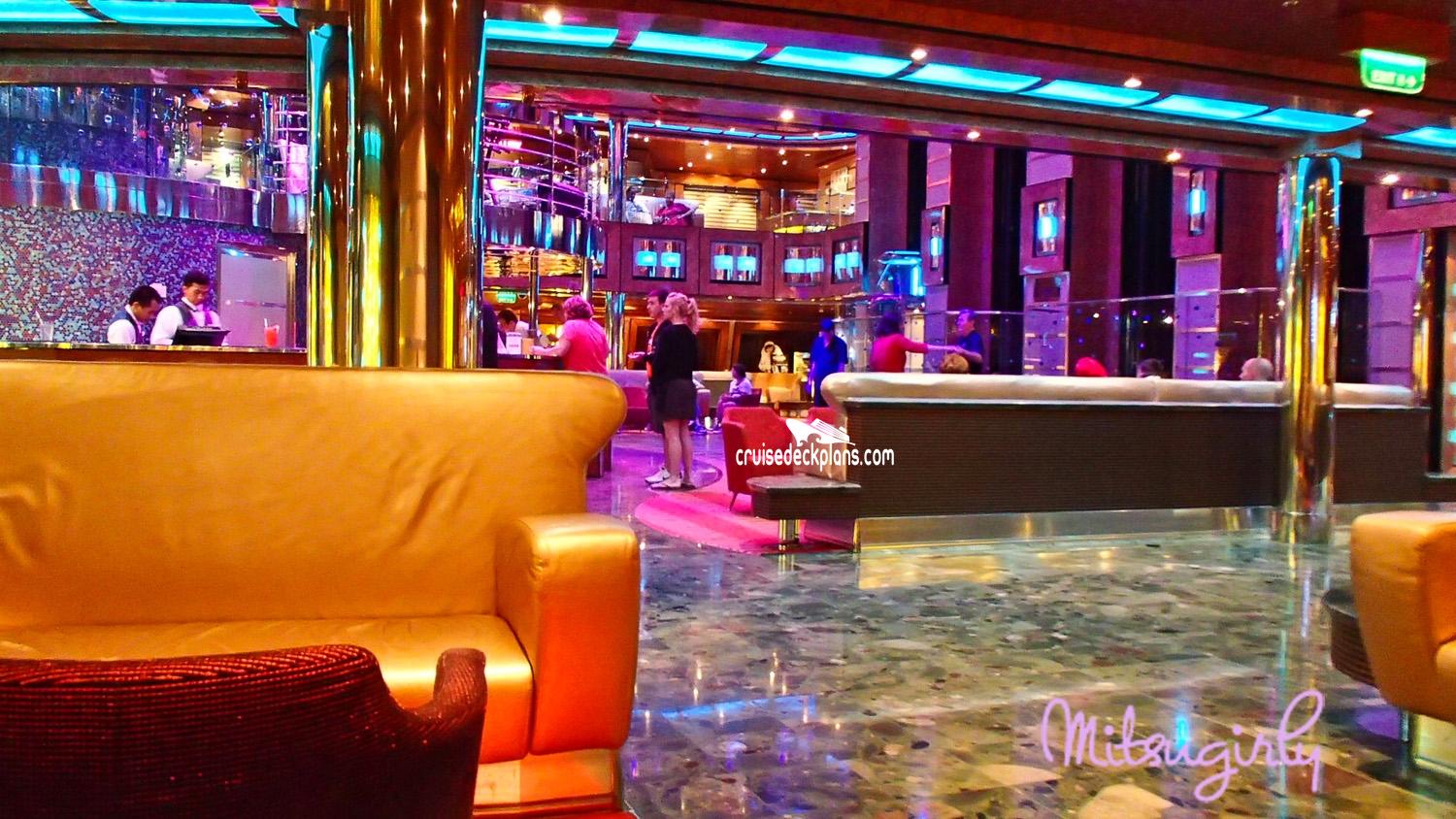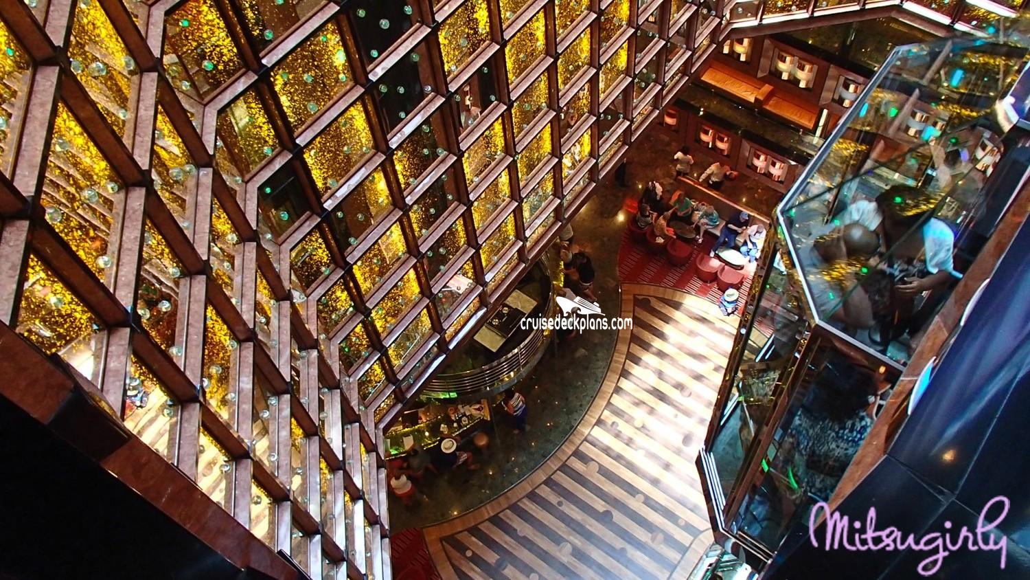 Main atrium that is open to decks above, has a bar, dance floor, guest services desk, shore excursion desk.