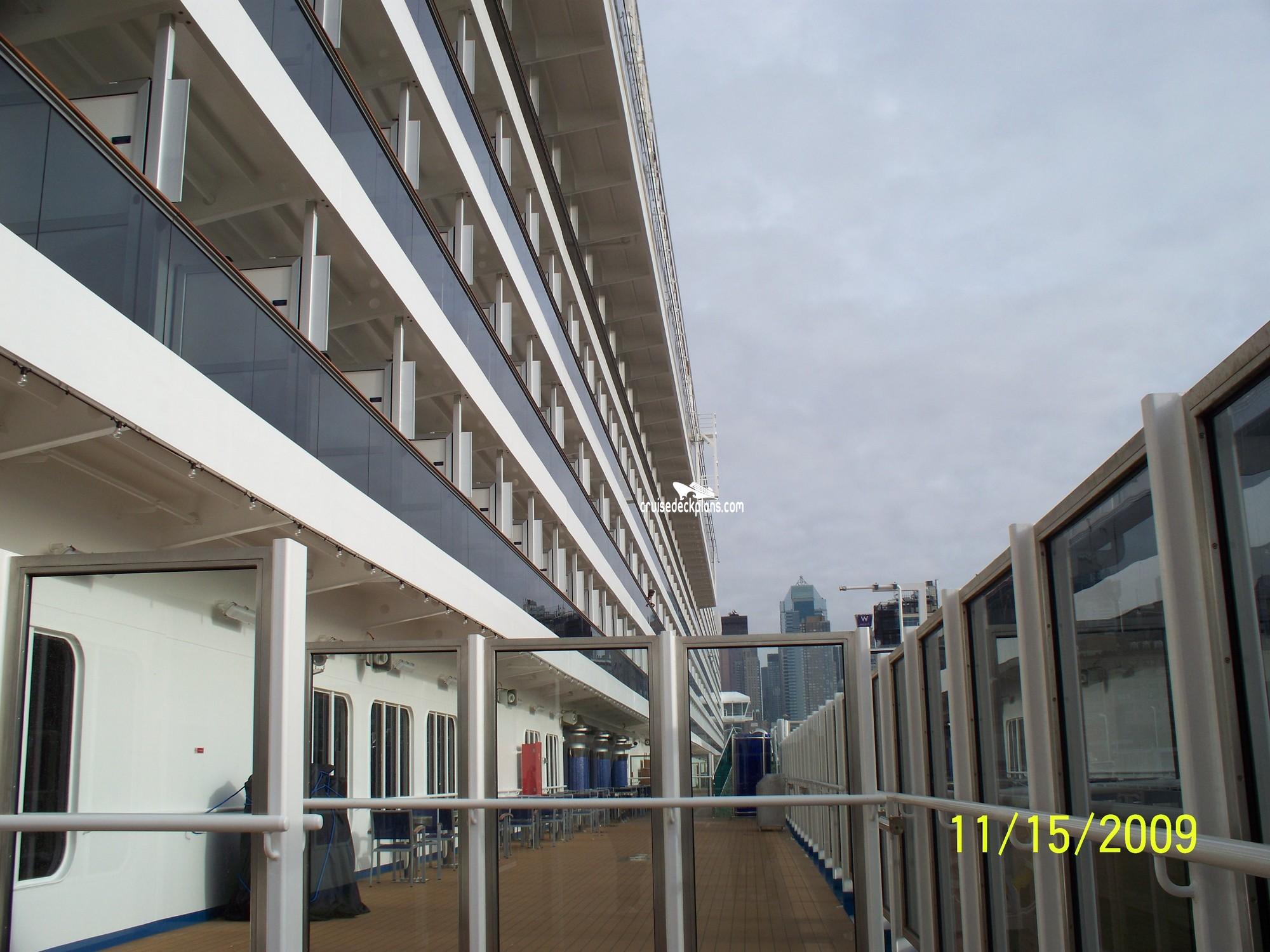 Outside promenade deck that circles the ship and has hot tubs and outside lounge areas.