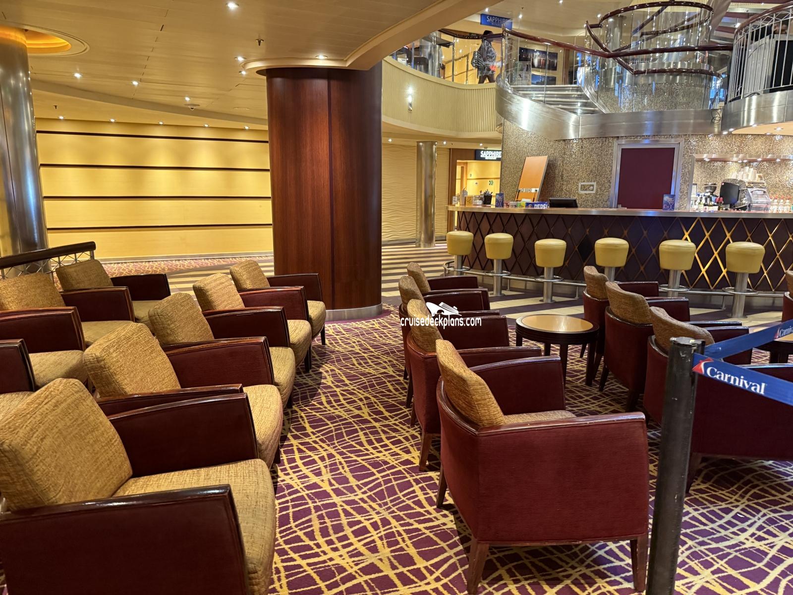 Ships atrium. On first level is dance floor and bar, lounge area, guest services desk, shore excursion desk. This is one of main entrance areas of the ship. Guest services is open 24 hours a day and also is location for lost and found. Shore excursion desk has information about ship sponsored shore excursions that you can purchase. There is also a seating area, 6 computer terminals for accessing the internet, a dance floor and this area features live music in afternoons and evening.