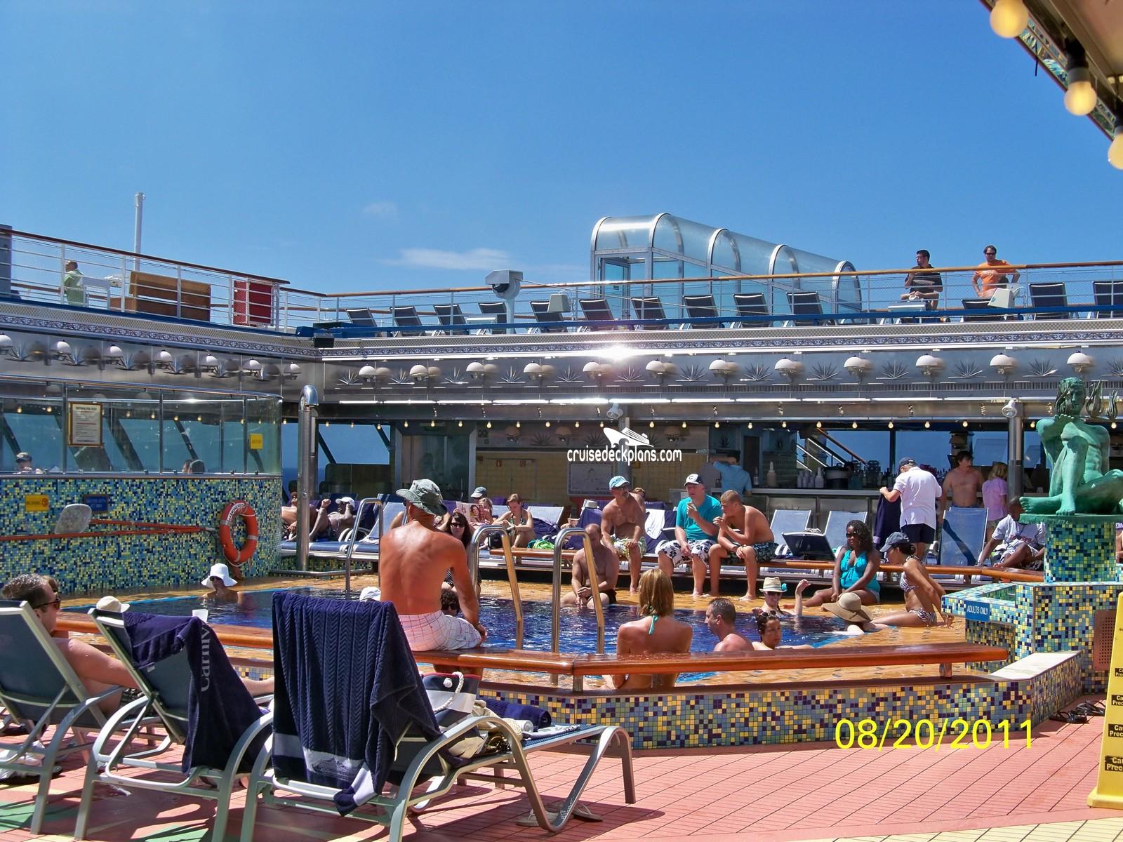 Pool located in the aft part of the Lido deck. Has a glass retractable roof with two hot tubs. Bar, Grille and tables and chair for seating. The pool typically open from 8:00 a.m. to 12:00 a.m. (hot tubs open till 10:00 p.m.). The pool is salt water and is 21 feet by 16 feet and has a depth of 4 feet 6 inches.