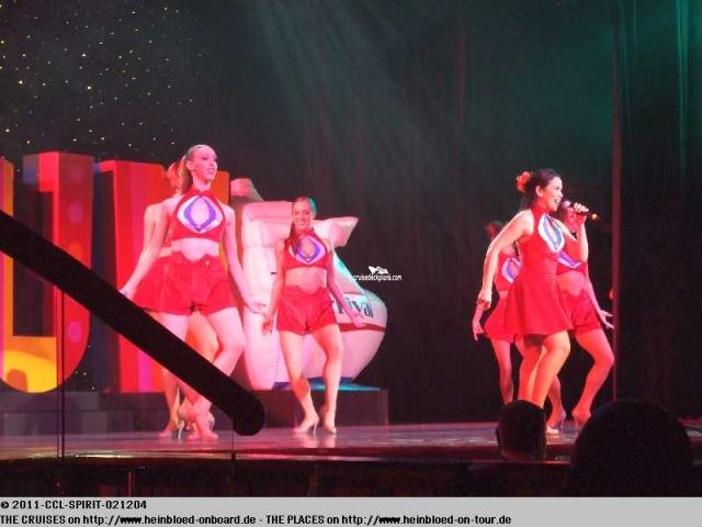 The ship's main stage productions take place here featuring dancers, musicians and performers; also used to host, amongst other things, audience participation game shows such as bingo.