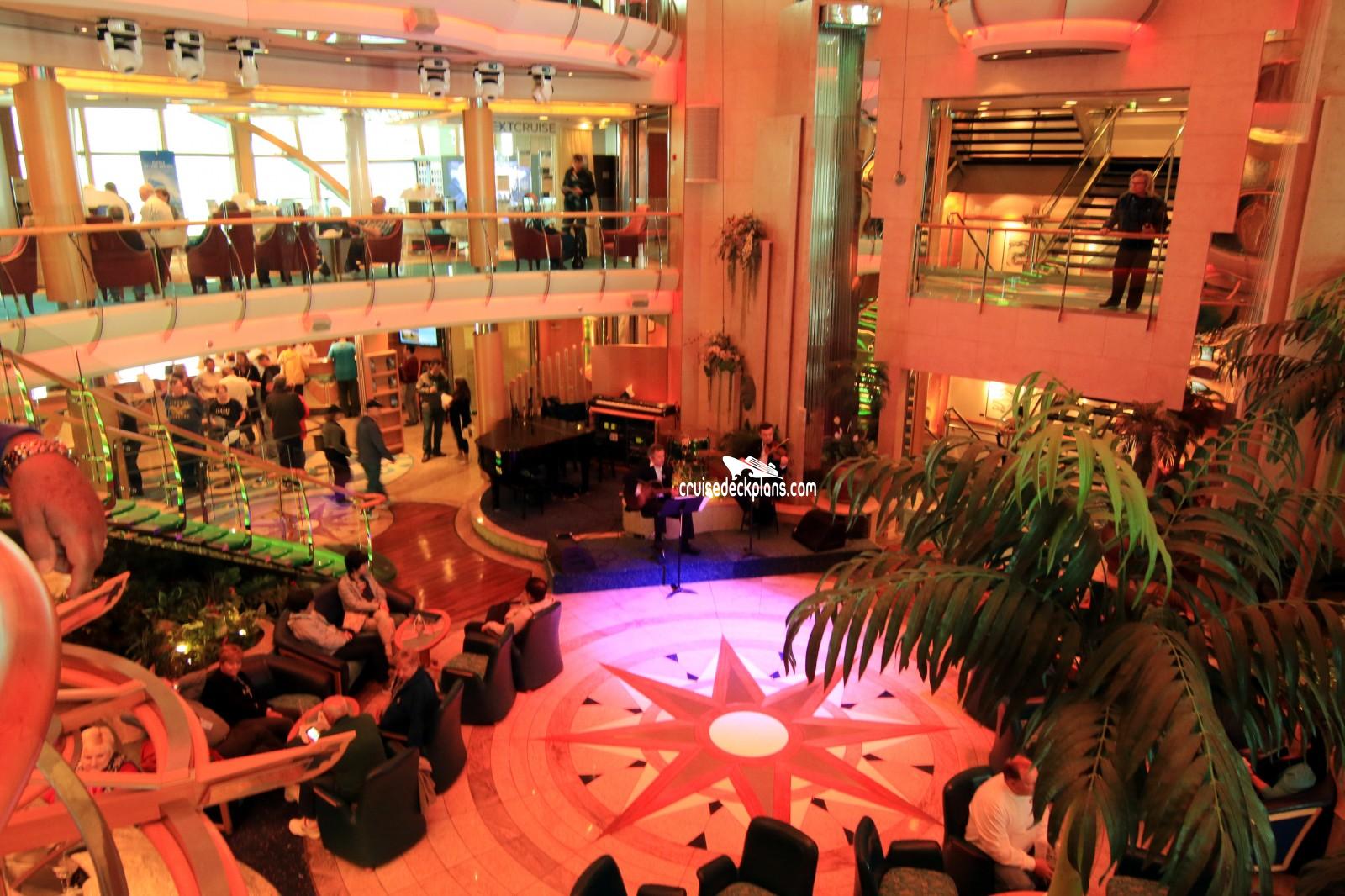 Ships atrium. On the first level is a lobby bar, guest relations and shore excursions desk