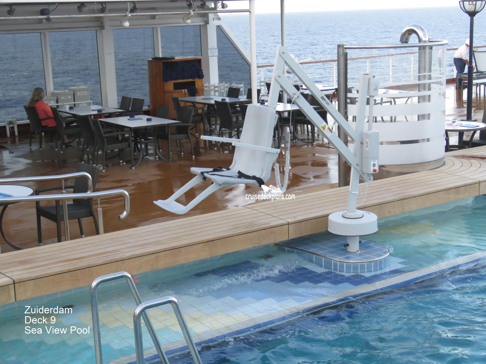 This page shows actual pictures for Zuiderdam Sea View Pool. Most of our pictures are contributed by actual cruisers. You will find that all the Zuiderdam Sea View Pool pictures on this page also posted directly onto our deck plans near the actual location the photo was taken. You can browse the pictures here or you can click on them as you are viewing the Zuiderdam deck plans. For deck plan viewing click on the ship button above or scroll down to view the pictures on this page.