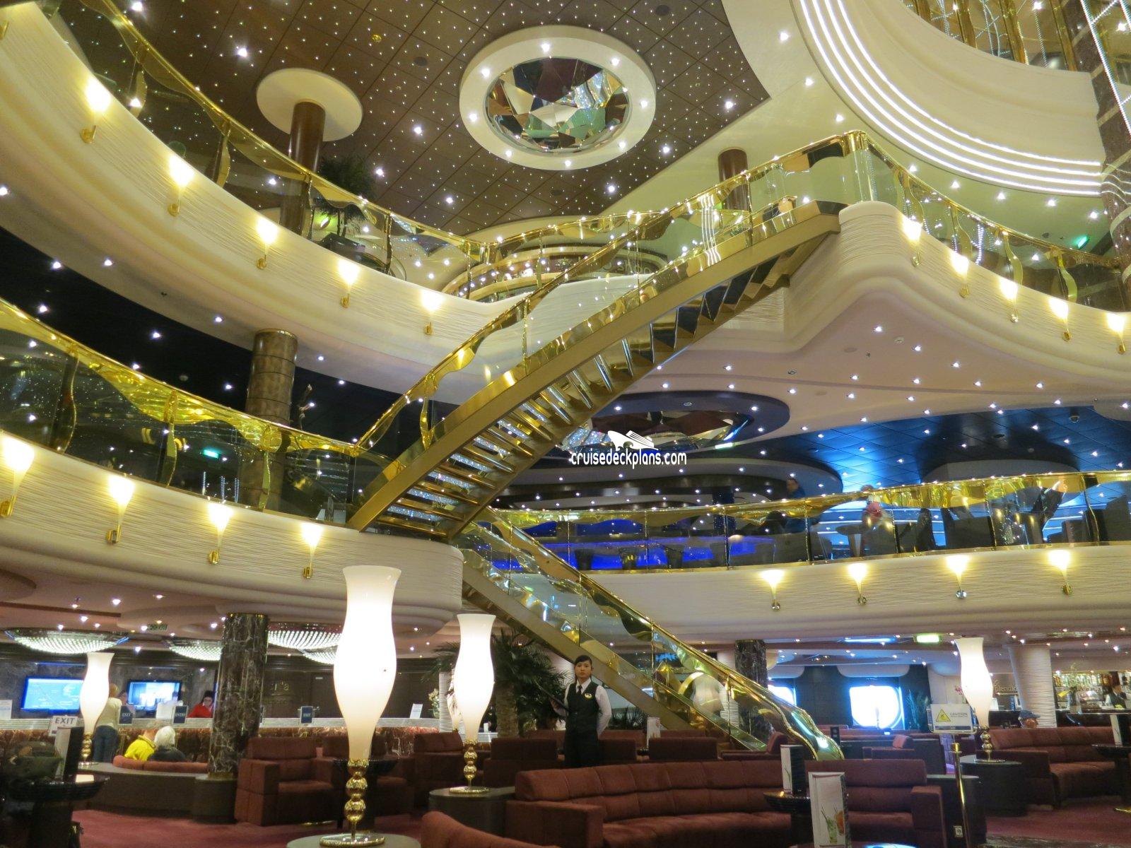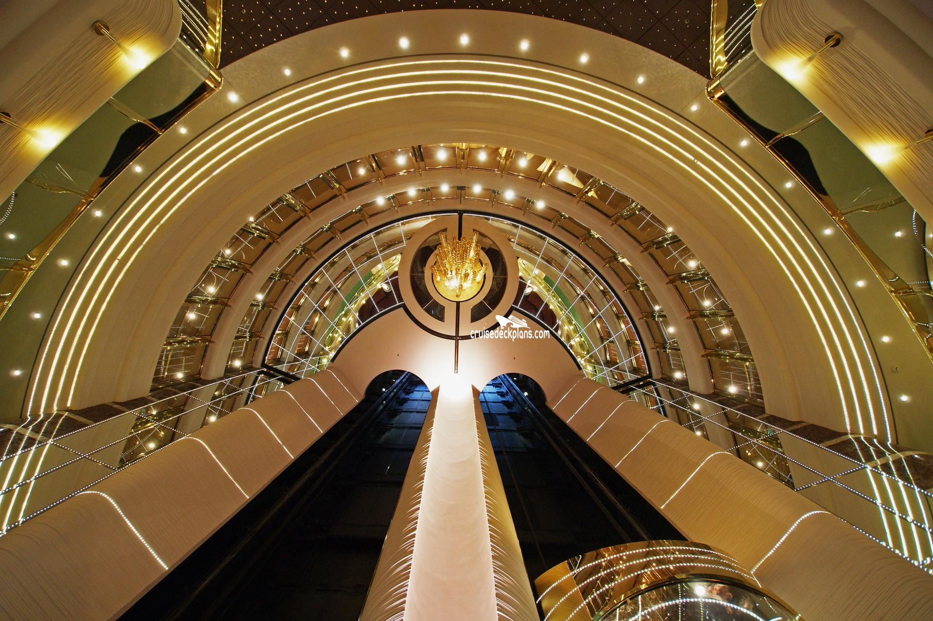 Ships Atrium. On first level is guest services, bar, lounge area and internet cafe. There are seats here for 93 guests.