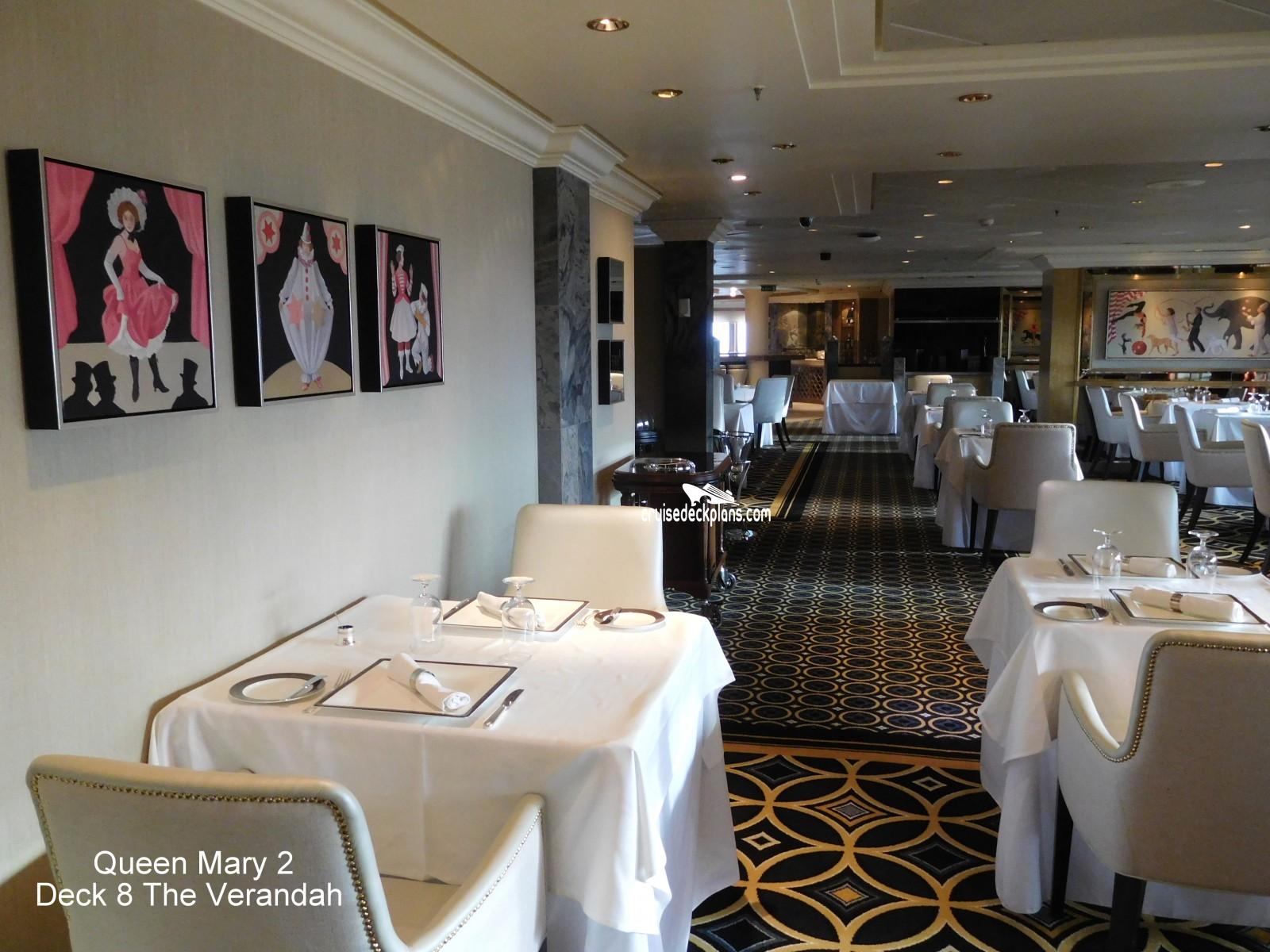 This page shows actual pictures for Queen Mary 2 The Verandah Restaurant. Most of our pictures are contributed by actual cruisers. You will find that all the Queen Mary 2 The Verandah Restaurant pictures on this page also posted directly onto our deck plans near the actual location the photo was taken. You can browse the pictures here or you can click on them as you are viewing the Queen Mary 2 deck plans. For deck plan viewing click on the ship button above or scroll down to view the pictures on this page.