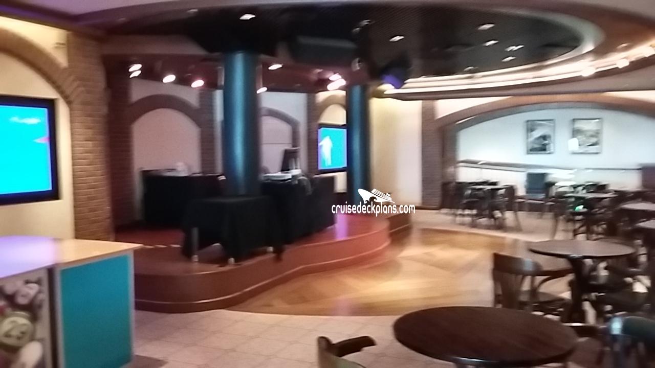 Sports bar located on deck 6 near the casino. Exposed iron girders and antique brick. Finished in dark wood and bottle green. British in style, beer on draught, entertainment such as quizzes and live bands. Occasional televised sporting events.