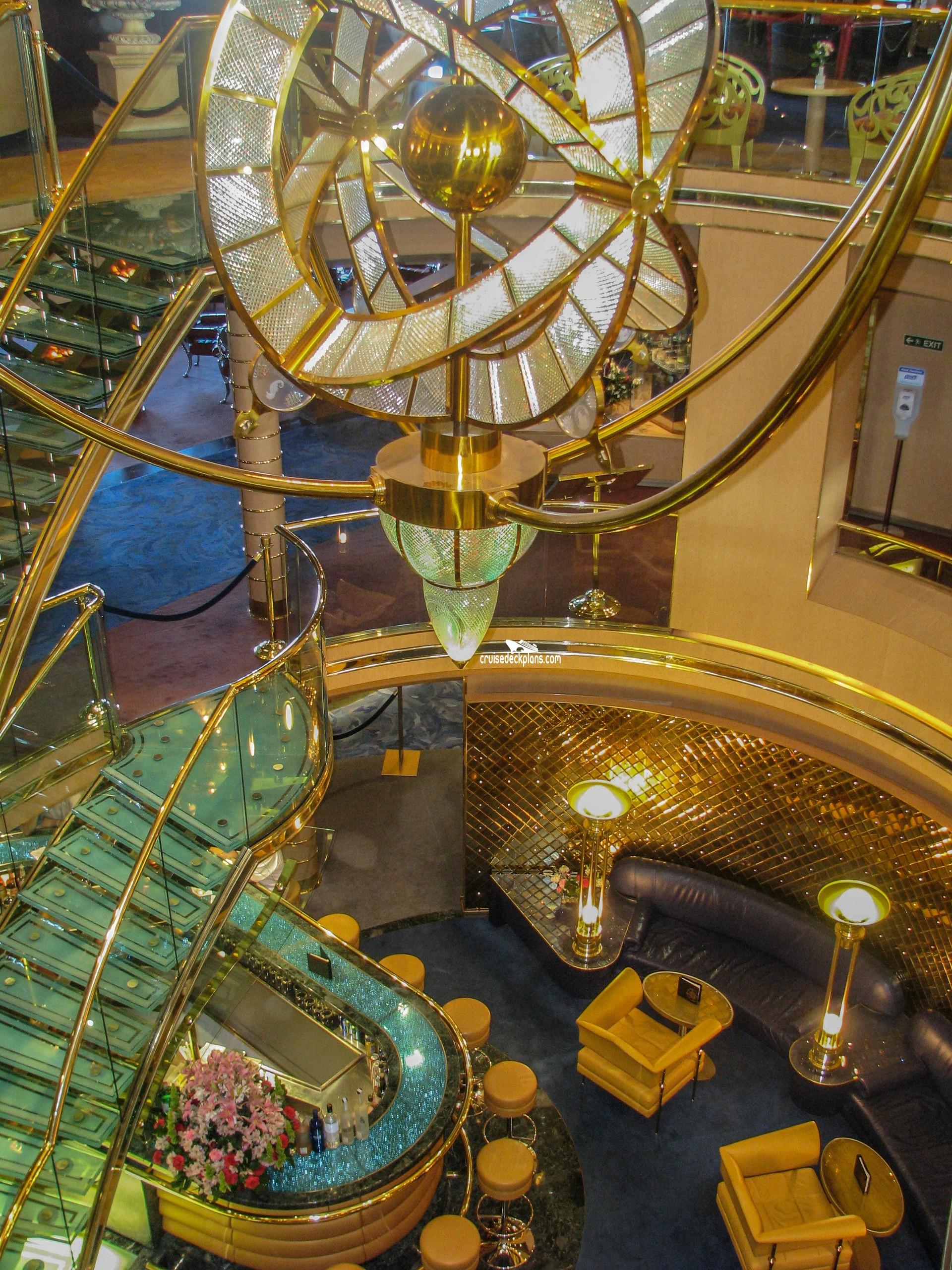 Multi-story atrium that spans the Main, Lower Promenade and Promenade decks. On first level is guest services, shore excursions and future cruise desk. There is also a bar and lounge area.