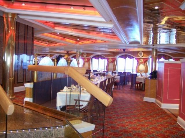 The larger of the ships split level formal dining rooms with a seating capacity of 1122. Offers sit-down waiter service. Typically opened for brunch (8:30 to 1:00 on deck 3) on sea days, on port days typically has open seating breakfast on deck 3 from 7:30 to 9:30 (times are subject to change.) Open nightly for assigned dining.