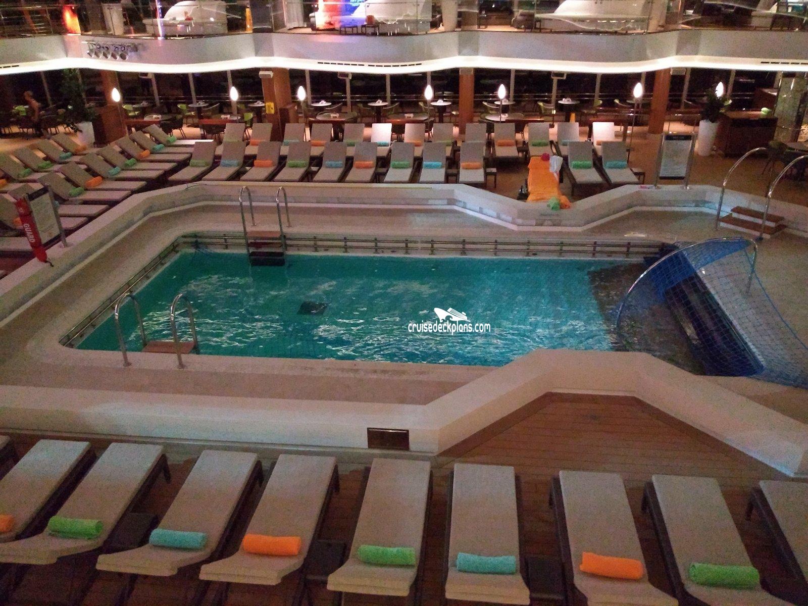Glass enclosed with retractable roof. Pool has 3 whirlpools and is serviced by Lido Bar.