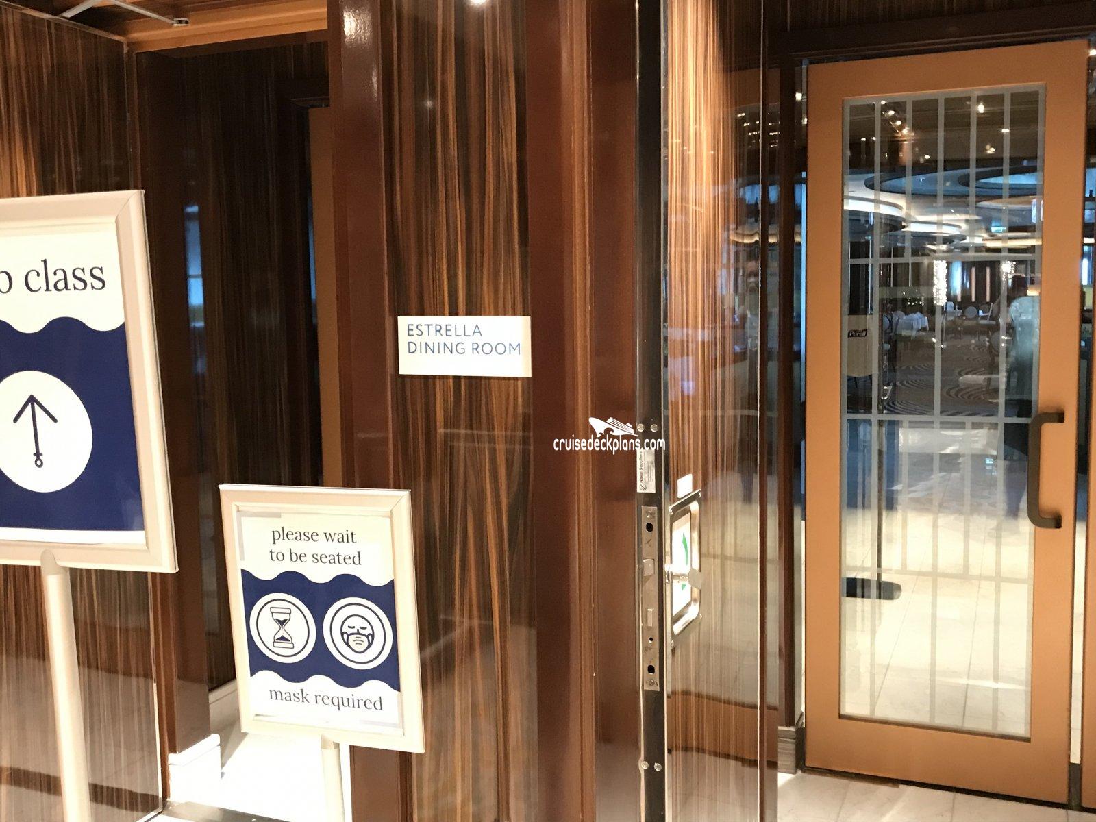 This page shows actual pictures for Sky Princess Estrella Dining Room. Most of our pictures are contributed by actual cruisers. You will find that all the Sky Princess Estrella Dining Room pictures on this page also posted directly onto our deck plans near the actual location the photo was taken. You can browse the pictures here or you can click on them as you are viewing the Sky Princess deck plans. For deck plan viewing click on the ship button above or scroll down to view the pictures on this page.