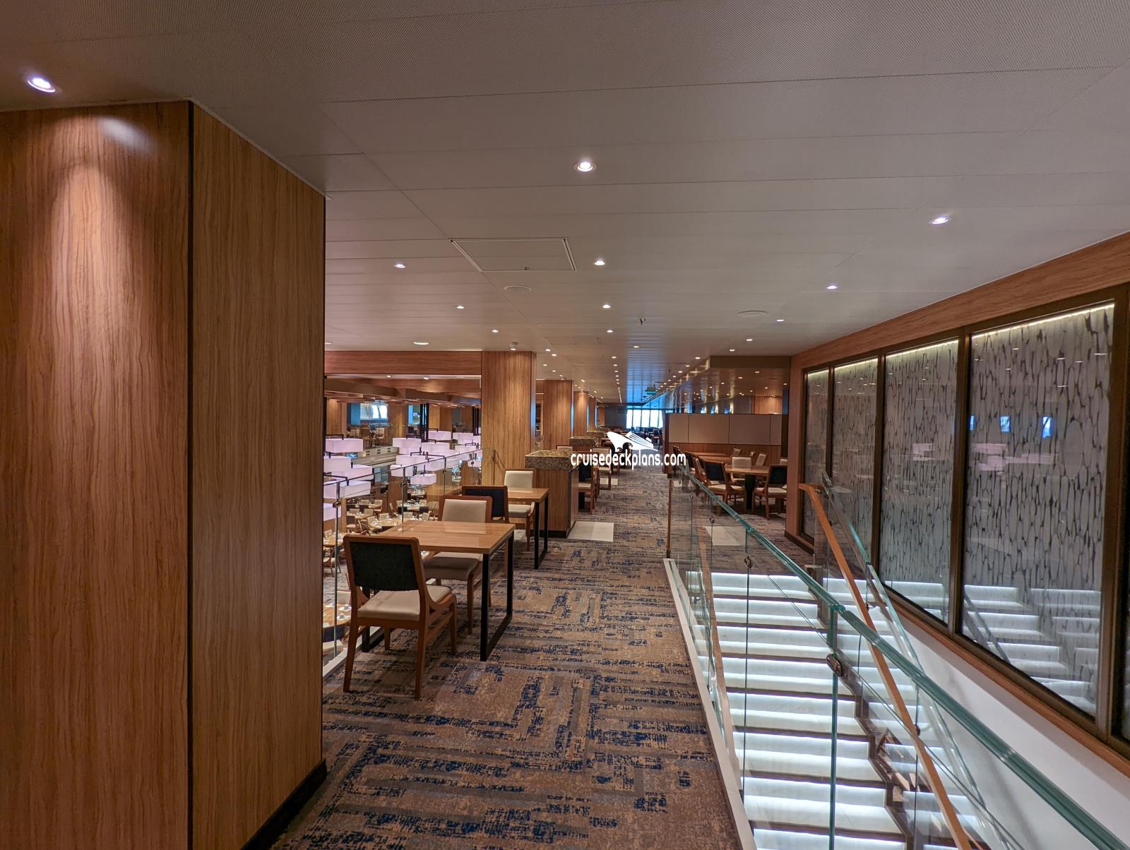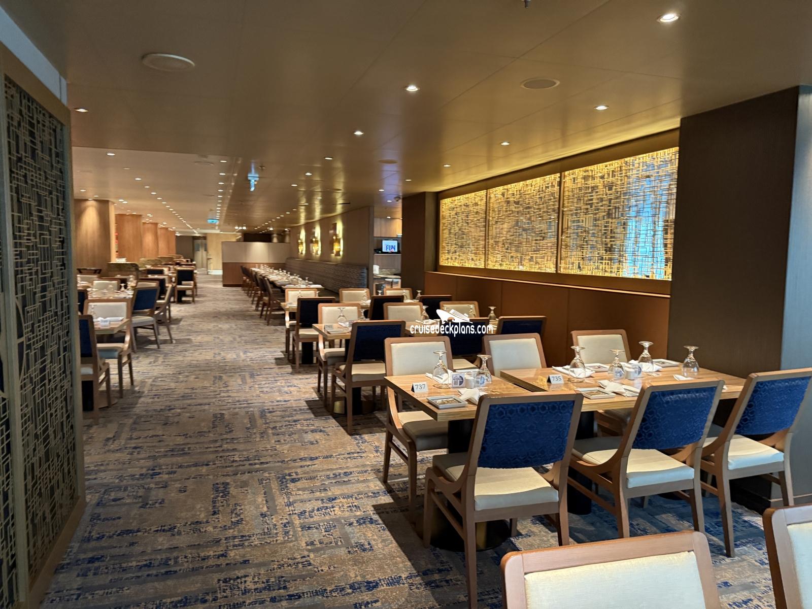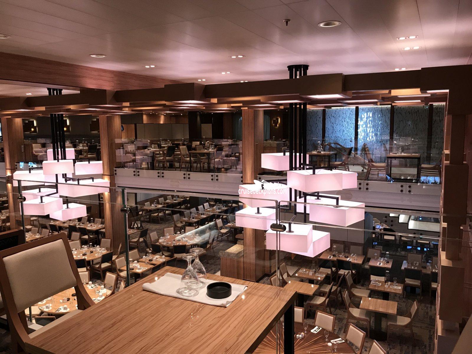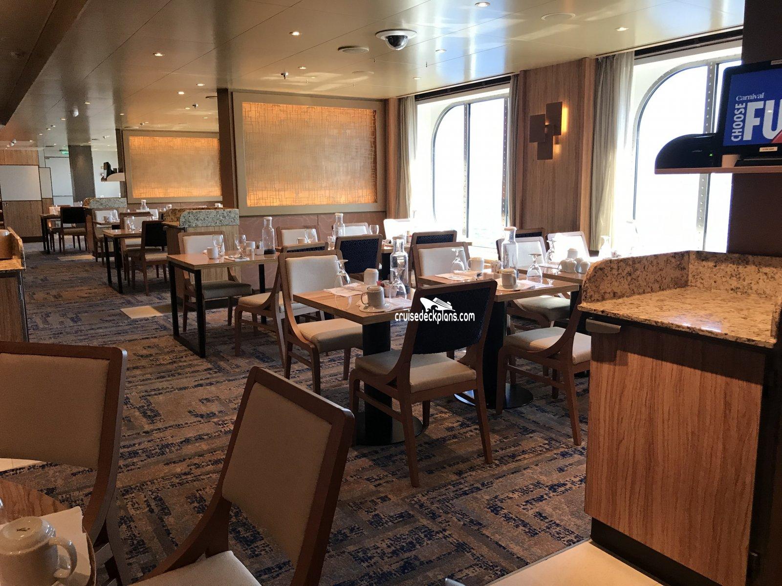 The ships main restaurant located in the aft of deck 3 and deck 4. Two levels. Offers sit-down waiter service. There is also a sit-down bar near the entrance for guests waiting to be seated. Open nightly for open dining at 5:45 p.m.