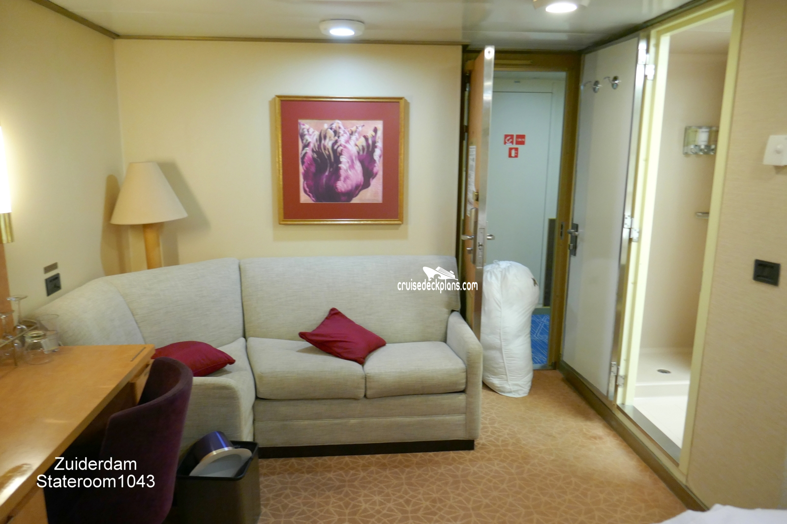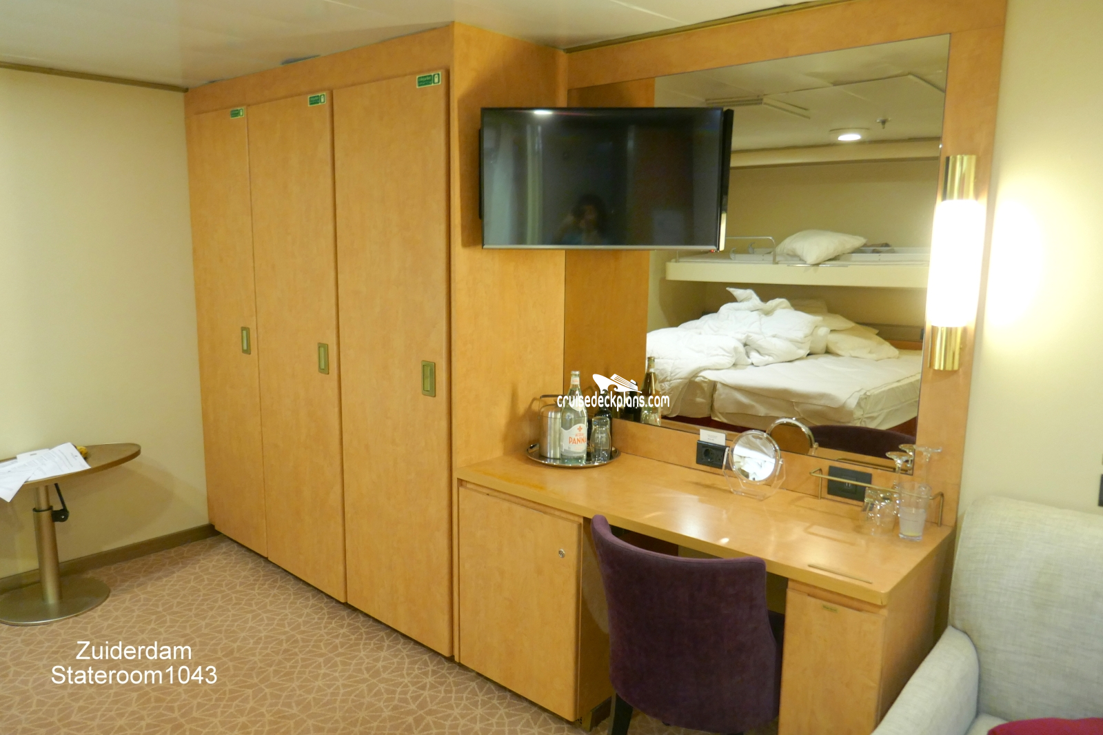 These are some actual stateroom pictures of cabin 1043 on the Zuiderdam. Click on images below for larger image and slide show. The slide show will show the date the picture was uploaded to out website. This date is useful because Zuiderdam typically will update its cabins every three to five years with new carpeting and decor. We will keep older pictures for you to compare the more recent photos to. The pictures are sorted by the newest ones first. Most of our cabin pictures are contributed by actual cruisers. We pay 50 cents for any that we use. You can upload your cabin photos HERE. Afer you are done looking at these photos and/or the videos below you can click here to select another cabin.