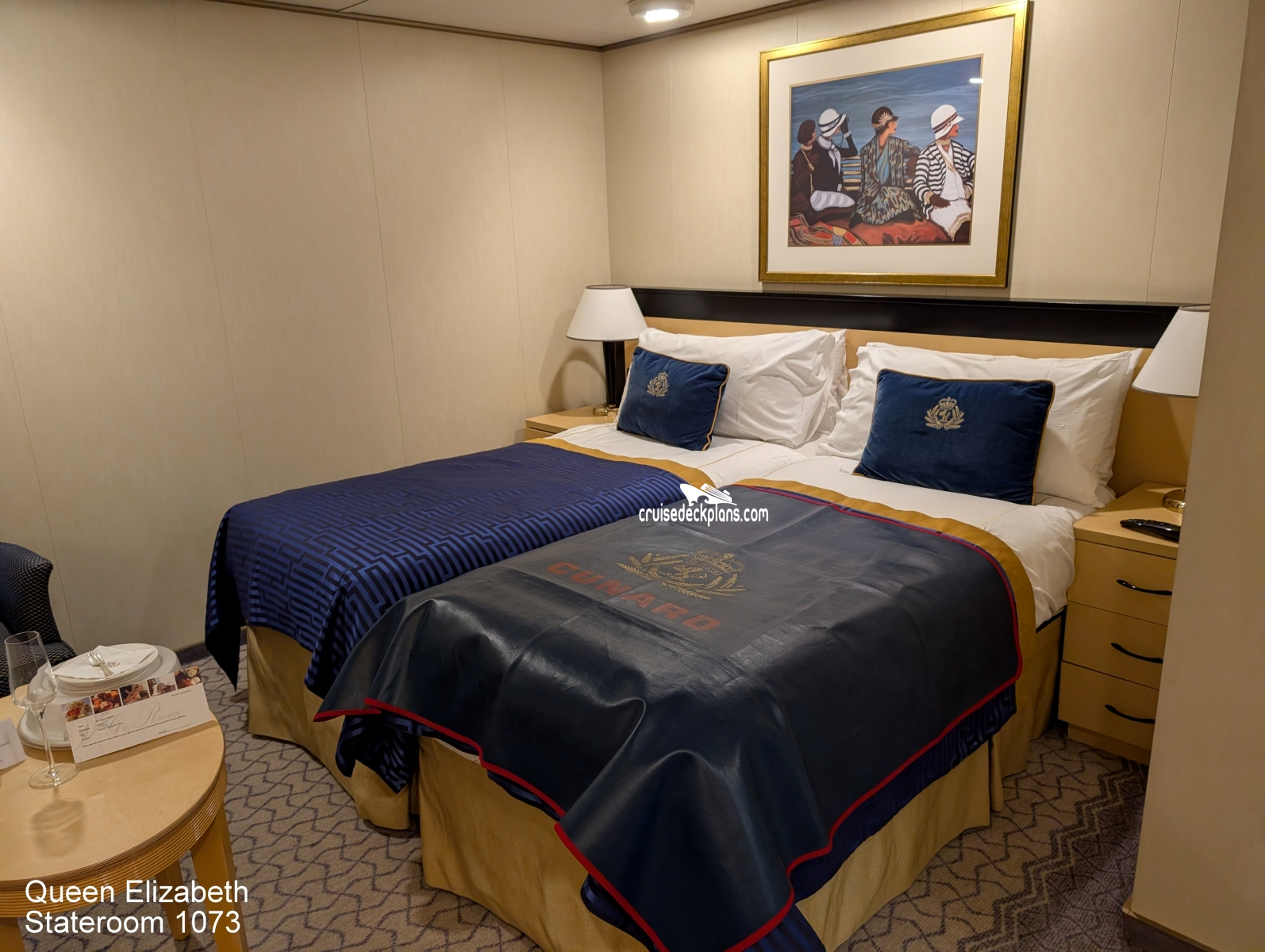 Queen Elizabeth Deluxe Interior cabin number 1073 ACTUAL videos and/or pictures, floor plans, diagrams and detailed features including a deck image of the actual location on the Queen Elizabeth ship for cabin 1073. Cruisedeckplans.com has 75,889 different (staterooms) cabins that have actual cabin pictures and/or cabin videos taken by real cruisers. That is plenty of coverage to provide you with a good sampling of all the different cabins on cruise ships. Take a minute and notice the breadcrumb menu above. This is a quick easy way to navigate our website. You can also use the menu above for menu items specific to the Queen Elizabeth cruise ship.