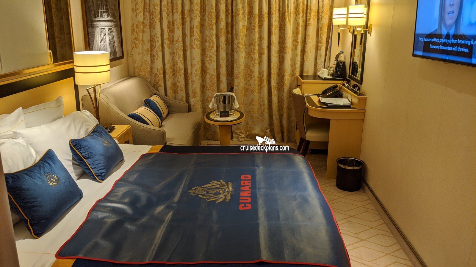These are some actual stateroom pictures of cabin 11021 on the Queen Mary 2. Click on images below for larger image and slide show. The slide show will show the date the picture was uploaded to out website. This date is useful because Queen Mary 2 typically will update its cabins every three to five years with new carpeting and decor. We will keep older pictures for you to compare the more recent photos to. The pictures are sorted by the newest ones first. Most of our cabin pictures are contributed by actual cruisers. We pay 50 cents for any that we use. You can upload your cabin photos HERE. Afer you are done looking at these photos and/or the videos below you can click here to select another cabin.