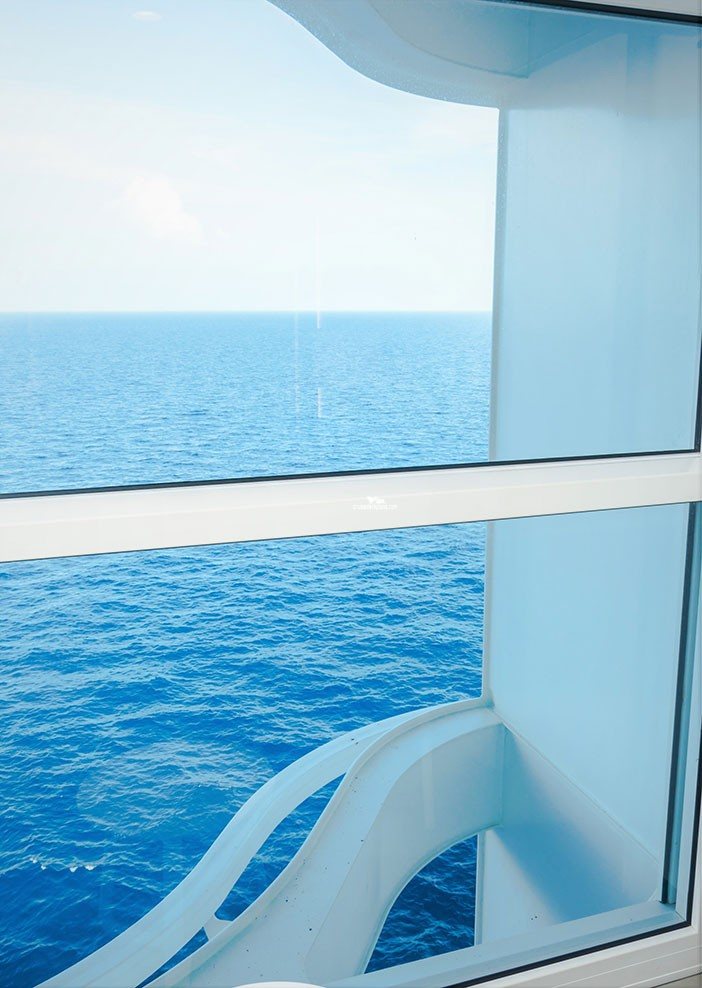 - Infinite Veranda. Balcony is separated from cabin by folding glass doors. A button is used to lower the upper outer balcony glass down into lower balcony railing