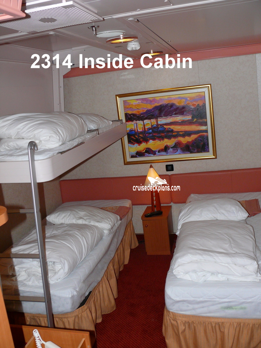Carnival Freedom Interior cabin number 2314 ACTUAL videos and/or pictures, floor plans, diagrams and detailed features including a deck image of the actual location on the Carnival Freedom ship for cabin 2314. Cruisedeckplans.com has 75,978 different (staterooms) cabins that have actual cabin pictures and/or cabin videos taken by real cruisers. That is plenty of coverage to provide you with a good sampling of all the different cabins on cruise ships. Take a minute and notice the breadcrumb menu above. This is a quick easy way to navigate our website. You can also use the menu above for menu items specific to the Carnival Freedom cruise ship.