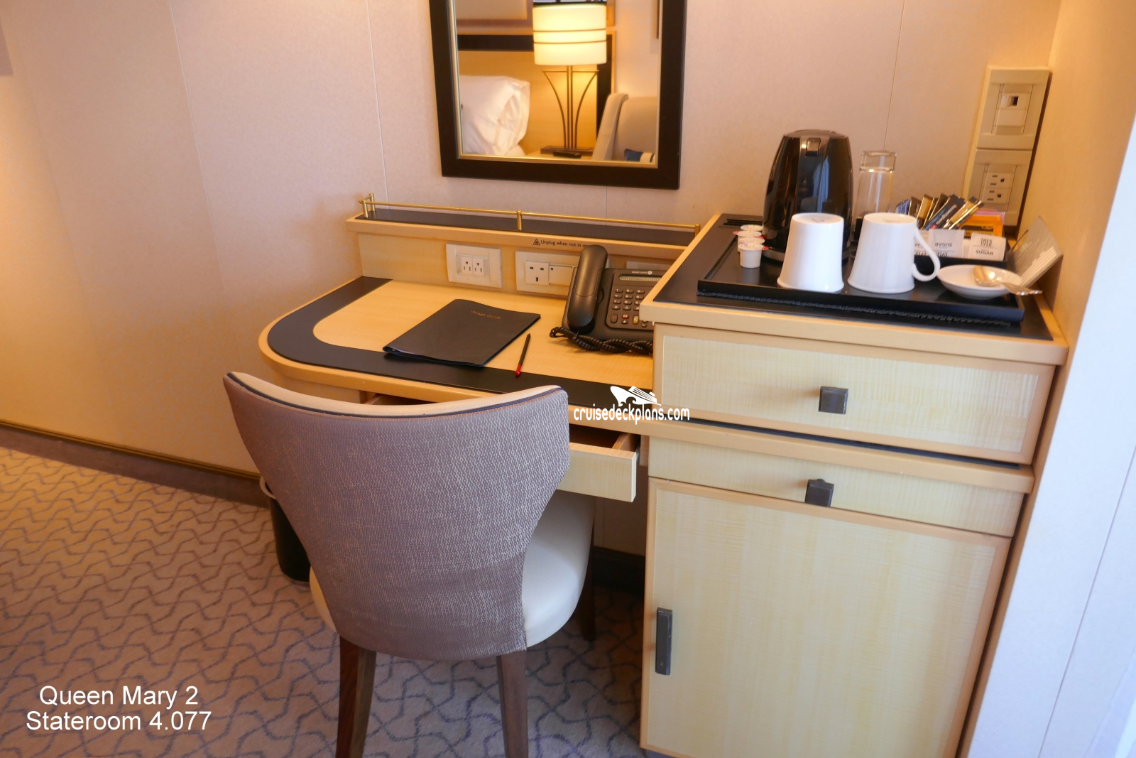 These are some actual stateroom pictures of cabin 4077 on the Queen Mary 2. Click on images below for larger image and slide show. The slide show will show the date the picture was uploaded to out website. This date is useful because Queen Mary 2 typically will update its cabins every three to five years with new carpeting and decor. We will keep older pictures for you to compare the more recent photos to. The pictures are sorted by the newest ones first. Most of our cabin pictures are contributed by actual cruisers. We pay 50 cents for any that we use. You can upload your cabin photos HERE. Afer you are done looking at these photos and/or the videos below you can click here to select another cabin.