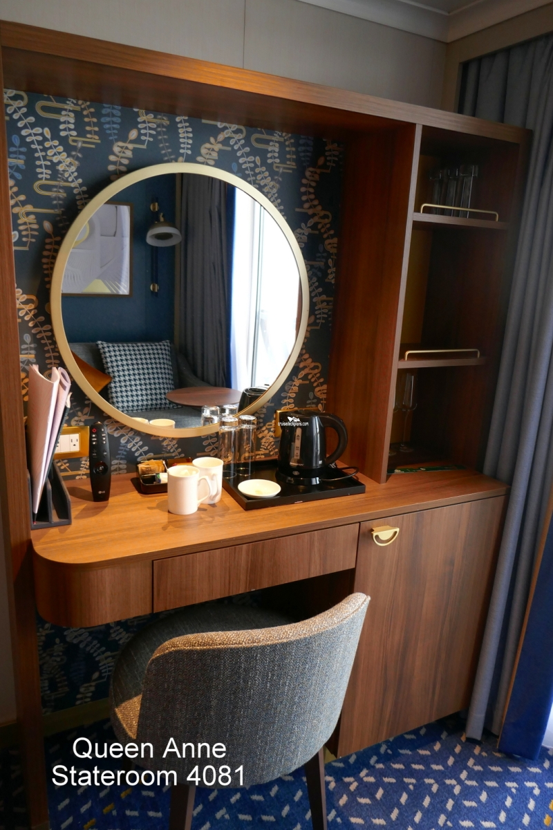 These are some actual stateroom pictures of cabin 4081 on the Queen Anne. Click on images below for larger image and slide show. The slide show will show the date the picture was uploaded to out website. This date is useful because Queen Anne typically will update its cabins every three to five years with new carpeting and decor. We will keep older pictures for you to compare the more recent photos to. The pictures are sorted by the newest ones first. Most of our cabin pictures are contributed by actual cruisers. We pay 50 cents for any that we use. You can upload your cabin photos HERE. Afer you are done looking at these photos and/or the videos below you can click here to select another cabin.