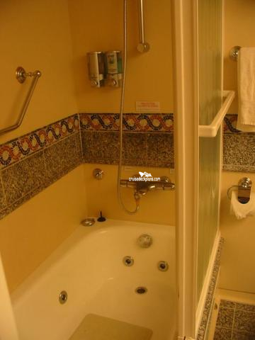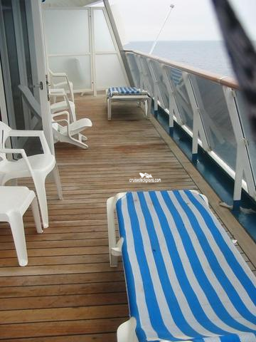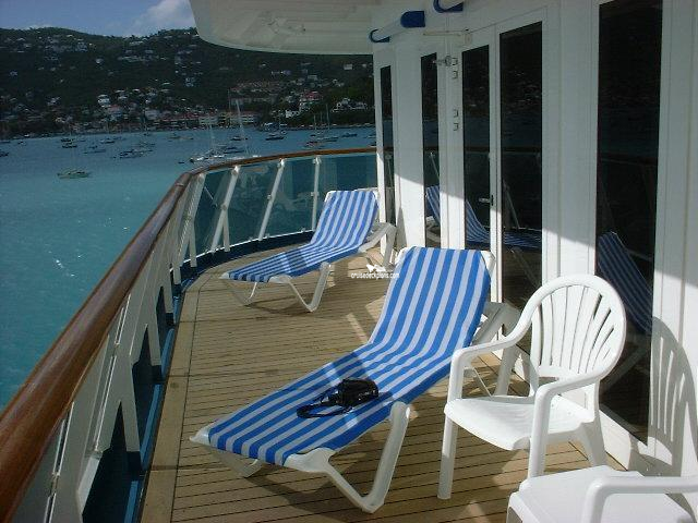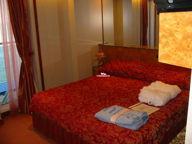 This cabin features a wrap around balcony. Staterooms 4228, 4237, 6260, 6329, 7298, 7347 ,8268 and 8273 feature a separate bedroom from sitting area with another LCD television and walk-in dressing area with vanity table and chair.