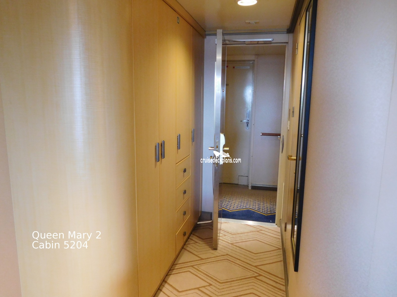 These are some actual stateroom pictures of cabin 5204 on the Queen Mary 2. Click on images below for larger image and slide show. The slide show will show the date the picture was uploaded to out website. This date is useful because Queen Mary 2 typically will update its cabins every three to five years with new carpeting and decor. We will keep older pictures for you to compare the more recent photos to. The pictures are sorted by the newest ones first. Most of our cabin pictures are contributed by actual cruisers. We pay 50 cents for any that we use. You can upload your cabin photos HERE. Afer you are done looking at these photos and/or the videos below you can click here to select another cabin.