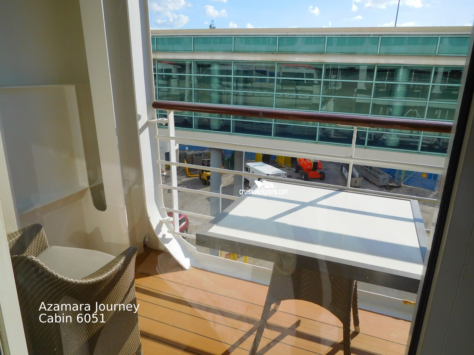 Azamara Journey Club Deluxe Verandah cabin number 6051 ACTUAL videos and/or pictures, floor plans, diagrams and detailed features including a deck image of the actual location on the Azamara Journey ship for cabin 6051. Cruisedeckplans.com has 73,698 different (staterooms) cabins that have actual cabin pictures and/or cabin videos taken by real cruisers. That is plenty of coverage to provide you with a good sampling of all the different cabins on cruise ships. Take a minute and notice the breadcrumb menu above. This is a quick easy way to navigate our website. You can also use the menu above for menu items specific to the Azamara Journey cruise ship.
